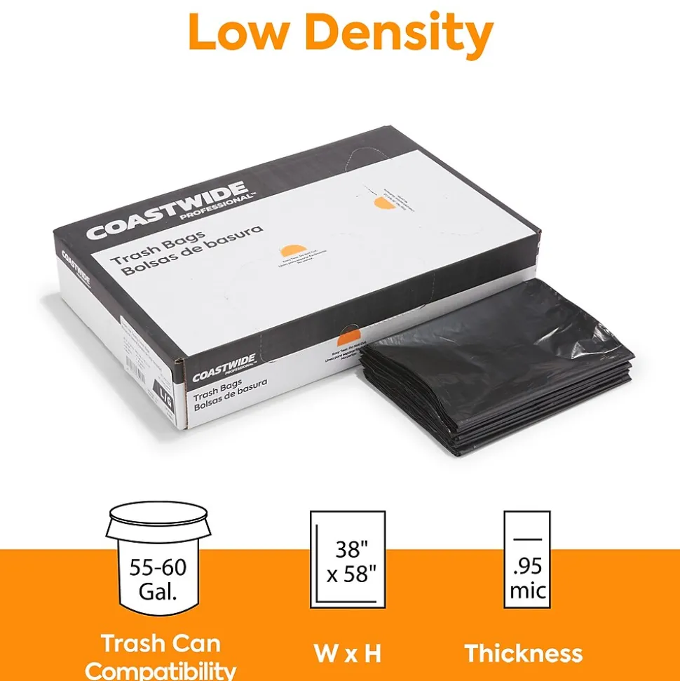 Coastwide Professional™ 55-60 Gallon Trash Bag, 38″ x 58″, Low Density, 0.95 mil, Black, 100 Bags/Box (CW18188)