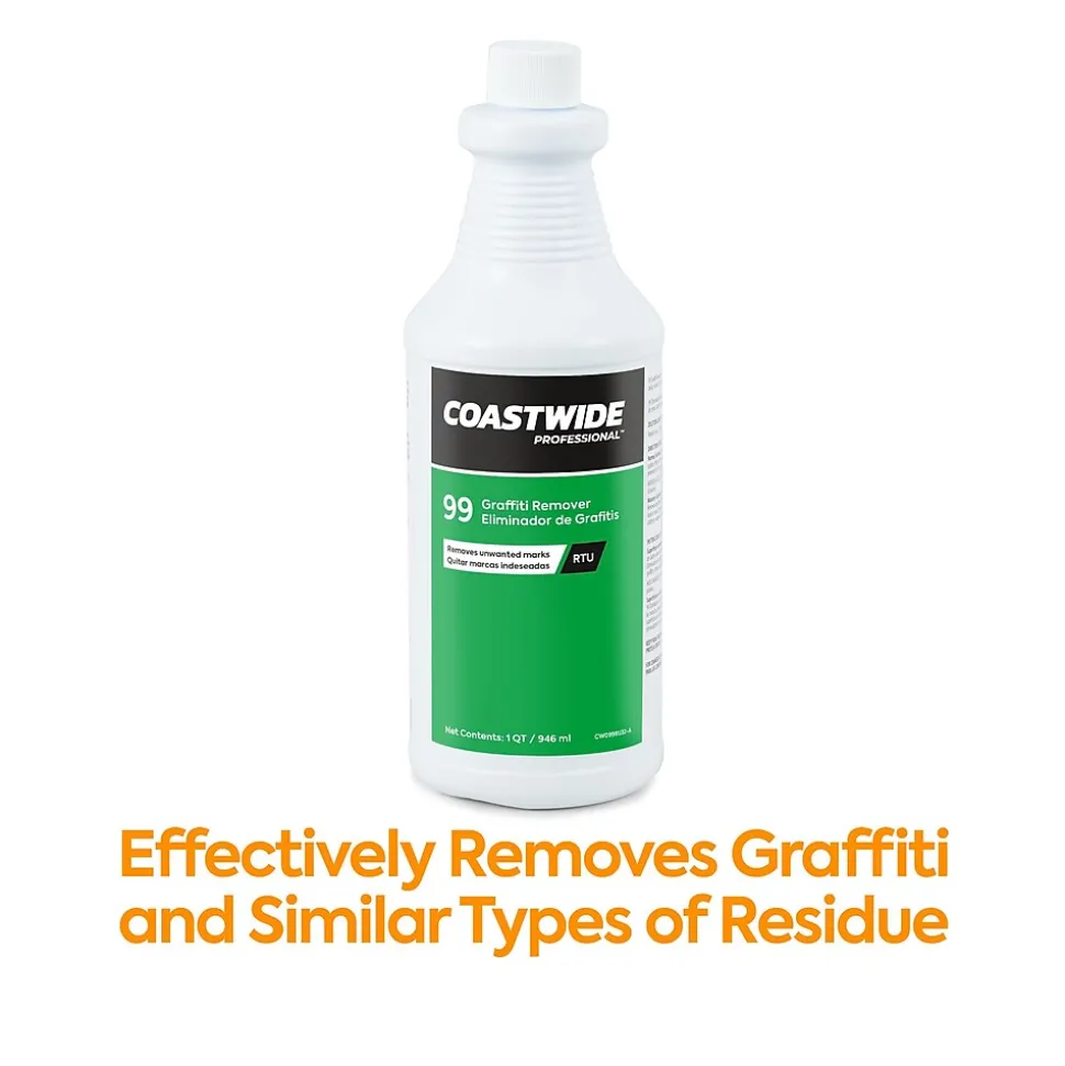 This Coastwide Professional graffiti remover 99 is perfect Use on surfaces of metal, brick, concrete, Formica, and fiberglass. Come in bulk packaging that includes six .95 liter bottles with pleasant odor. Bottles are ready to use what makes cleaning faster. Contains no acetone, methylene chloride, toluene, methanol, acids or other hazardous solvents.