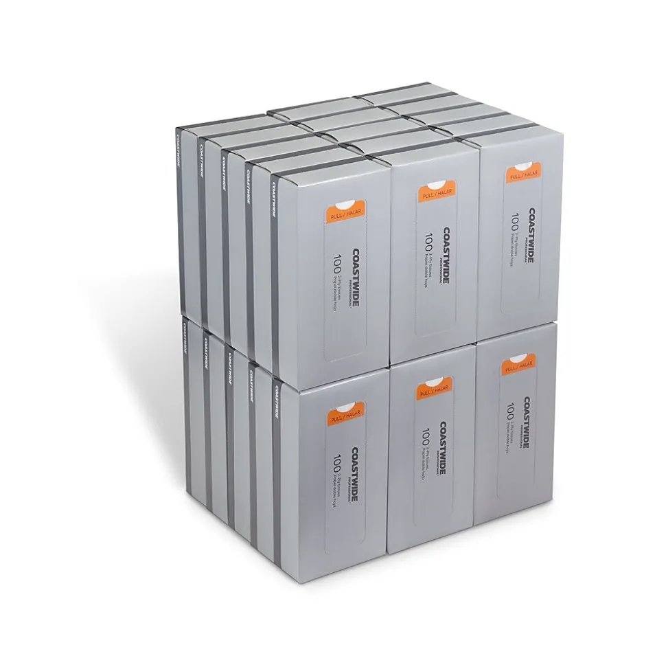 Keep your supply closet easily stocked with this carton of 30 boxes of facial tissues. The absorbent two-ply construction handles the hardest of sneezes while being soft and gentle on skin, and the convenient dispenser box lets employees and visitors grab a tissue as needed. With 100 tissues in each box of Coastwide Professional™ two-ply facial tissues, you’ve got enough for shared restrooms, break rooms and desks.
