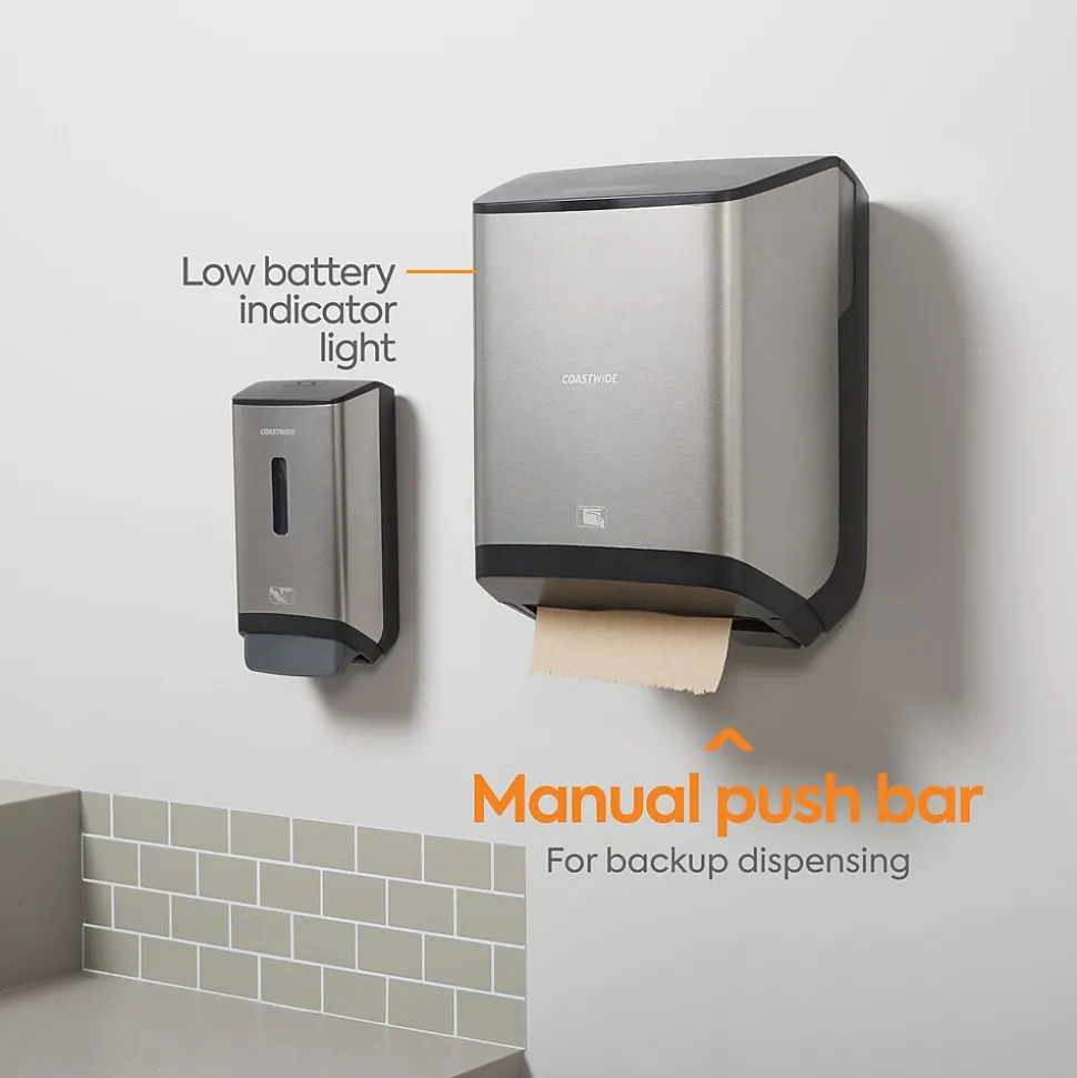 - Features push bar to manually dispense paper towels if batteries need to be changed