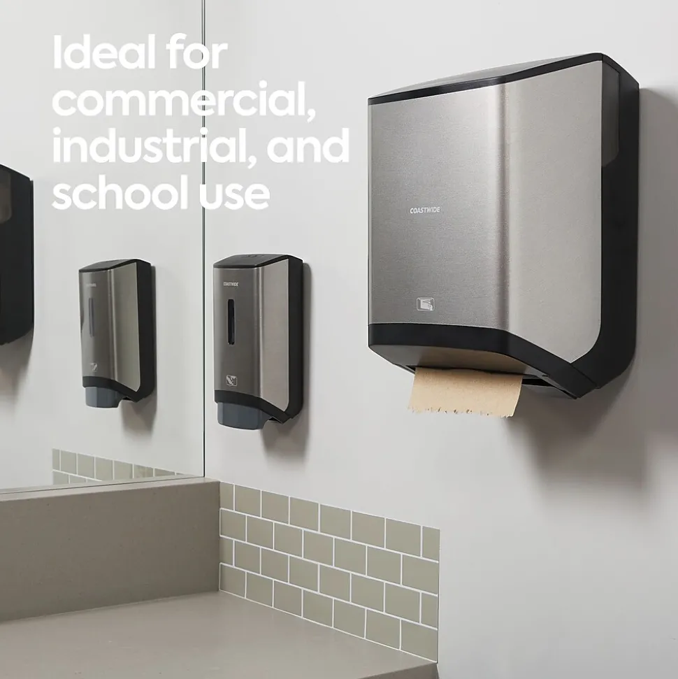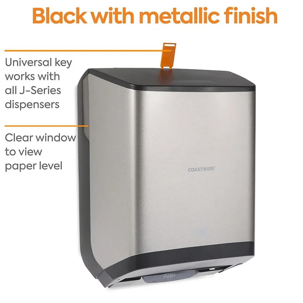 Enable simple hand drying in busy washrooms with this automatic hardwound towel dispenser. The sheet length, sensor distance and delay time are adjustable to make an 800-foot J-Series hardwound towel roll last longer, and the touch-free motion-activated operation helps prevent cross-contamination. This high-capacity Coastwide Professionalâ„¢ J-Series electronic hardwound towel dispenser boasts color-coded interior touchpoints, so janitorial staff can quickly locate and access touch points for reloading and is engineered to work with J-Series hardwound towel.