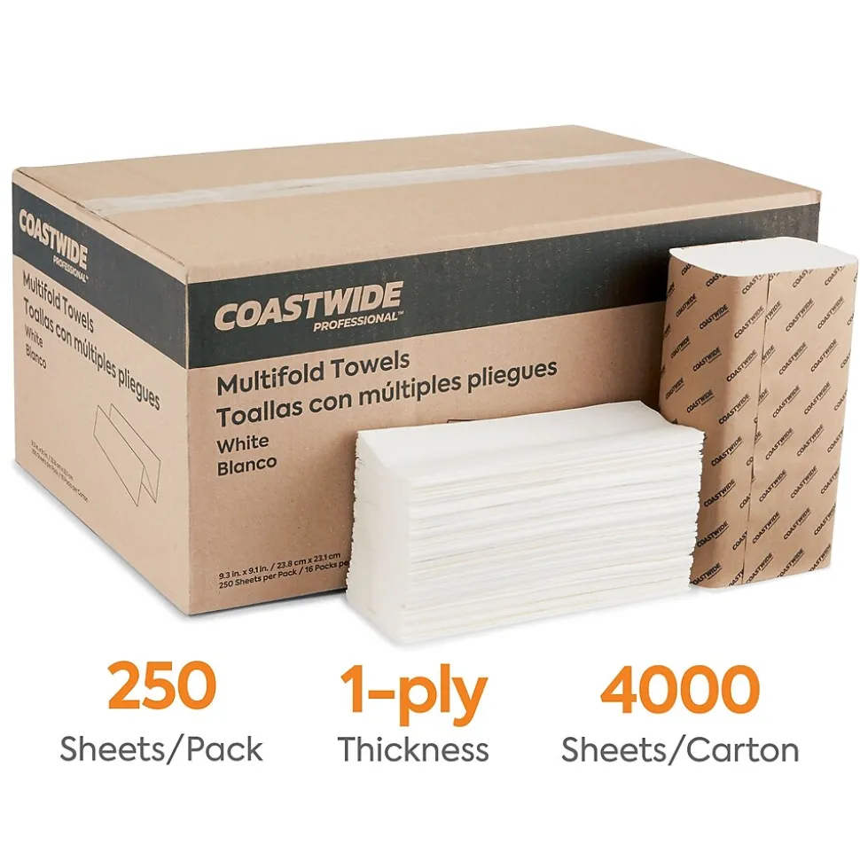 Designed for use in commercial workplaces and public restrooms, these Coastwide Professional one-ply paper towels fit neatly into dispensers for convenient access. Simply remove the outer wrapping on each bundle and place the towels in your dispenser. Add these sturdy, absorbent sheets in breakrooms and dining areas to clean up spills, or keep them in the office’s restrooms to promote cleanliness in the workplace. Each package contains 4,000 folded paper towels, which ensures a plentiful supply for your office. This reduces the amount of time spent reordering supplies, so you can focus on more important day-to-day operations.