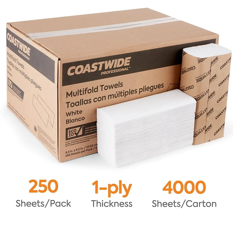 Provide visitors to your building with an effective way to dry their hands using these multifold paper towels. The 16 individually wrapped 250-sheet carton make it easy to stock all your folded paper towel dispensers, and thick, absorbent construction helps reduce paper waste. These Coastwide Professional™ white recycled multifold paper towels are Green Seal Certified to help your business earn LEED credits.