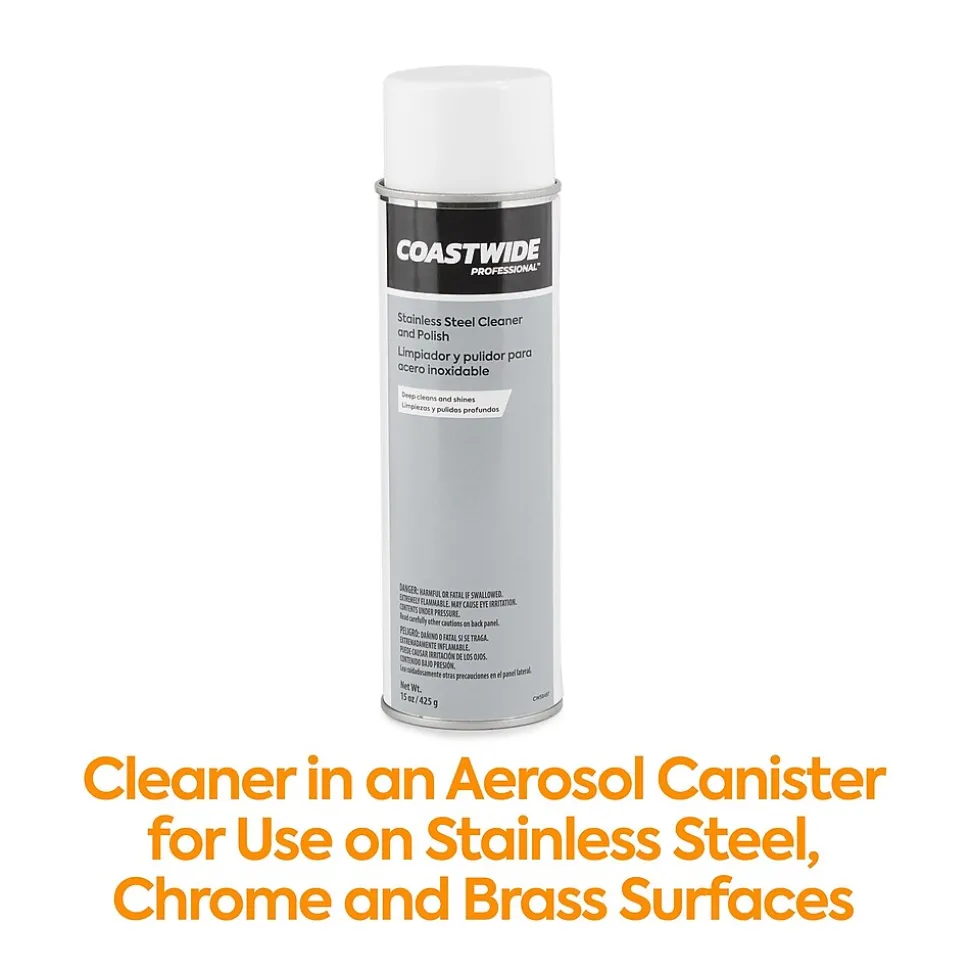 Provide an effective cleaning solution for janitorial staff with this stainless steel aerosol cleaner and polish. The color-coded label supports easy product identification for hassle-free storage and retrieval. This Coastwide Professional 15-ounce stainless steel cleaner and polish features a VOC-compliant oil-based formula, which delivers a deep shine to help restore metal objects, and the lemon scent leaves a pleasant citrus aroma.
