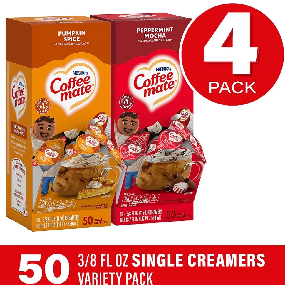 - A 4 count variety pack of Seasonal Coffee Mate creamers with 2 pumpkin and 2 peppermint packs