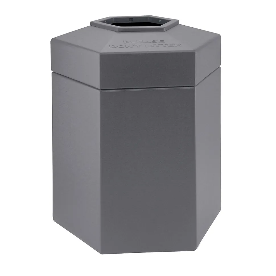 The gray, PolyTec Series 45 Gallon Hex Waste Container has a unique, stream lined appearance that offers a larger capacity and convenient ease of use. The patented Grab Bag system secures the trash bag in place for a cleaner appearance with a decreased chance of the lid blowing off. These heavy-duty waste containers are designed to withstand the harshest environments as well as offer easy maintenance. Environmentally friendly containers are molded from long lasting recycled polyethylene. They won’t rust, dent or chip.