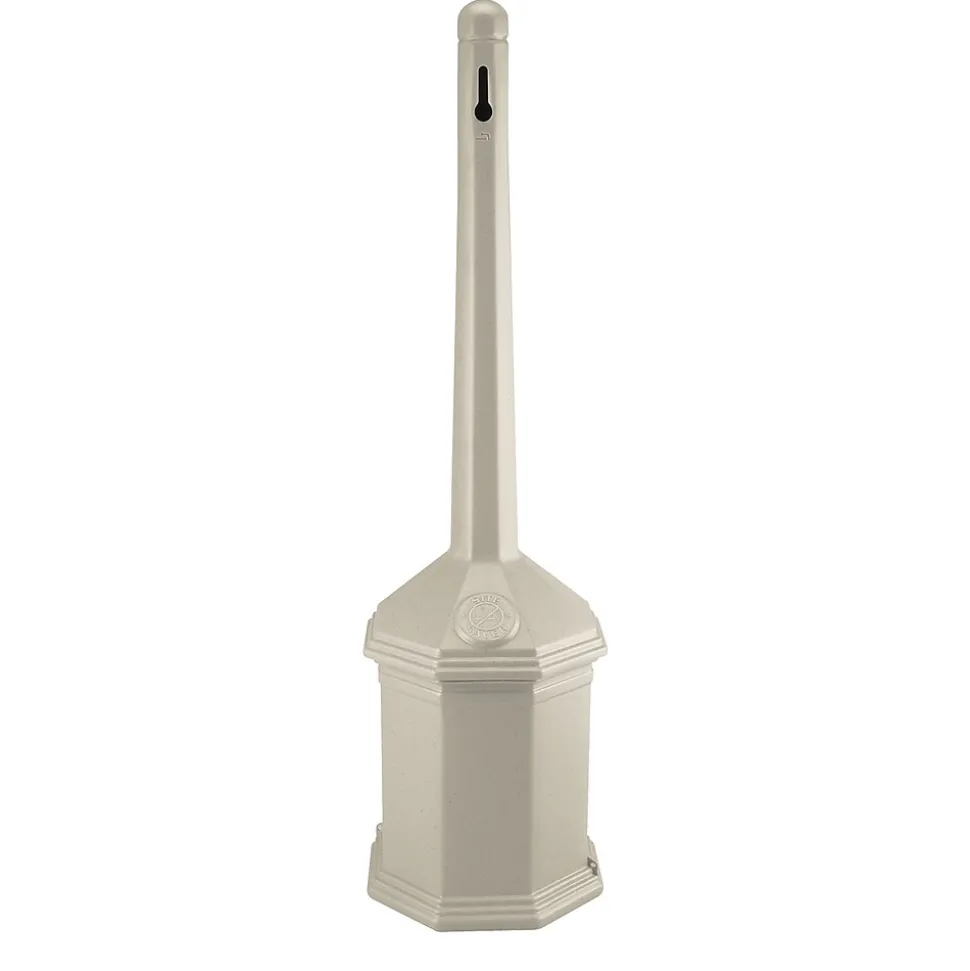 Keep cigarette litter hidden from public view while maintaining a clean and neat appearing entrance or smoking break area. The compact and stream-lined beige Site Saver® offers a unique hexagon style that makes it ideal for smaller entrances and designated smoking areas with a keyhole opening that allows cigarettes to easily enter but keeps unwanted litter out. The patented oxygen-restricting design extinguishes cigarettes quickly; no sand or water required. Ash urn includes 5-quart galvanized pail to easily empty cigarette litter.