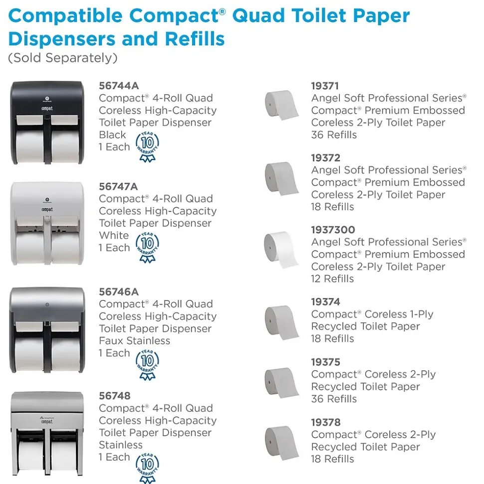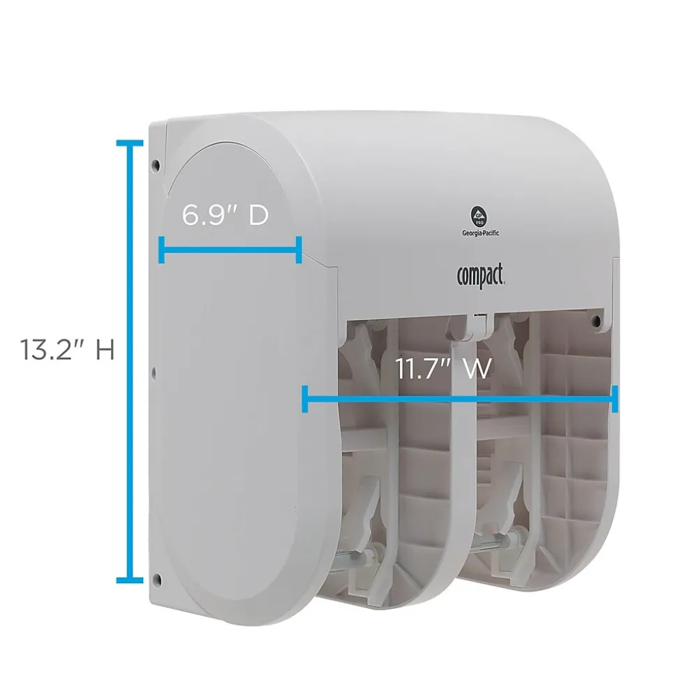 Compact® coreless toilet paper dispensing systems answer key needs for facilities managers when it comes to toilet paper for the restrooms. These high capacity systems help you avoid running out between service intervals and help reduce maintenance time typically spent changing out conventional toilet paper rolls. These systems save up to 95% in packaging waste compared to GP PRO’s standard roll toilet paper by eliminating stub-rolls, corrugate cores, paper roll wraps and the outer cardboard shipping case. And because the Compact® case has a smaller footprint, it requires less storage space. Compact® coreless toilet paper dispensers are designed to give the facility high capacity for continuous service. GP PRO is a division of Georgia-Pacific Consumer Products. We deliver well-designed, durable and easy-to-maintain professional solutions to meet the handwashing and cleaning needs for a range of business applications.