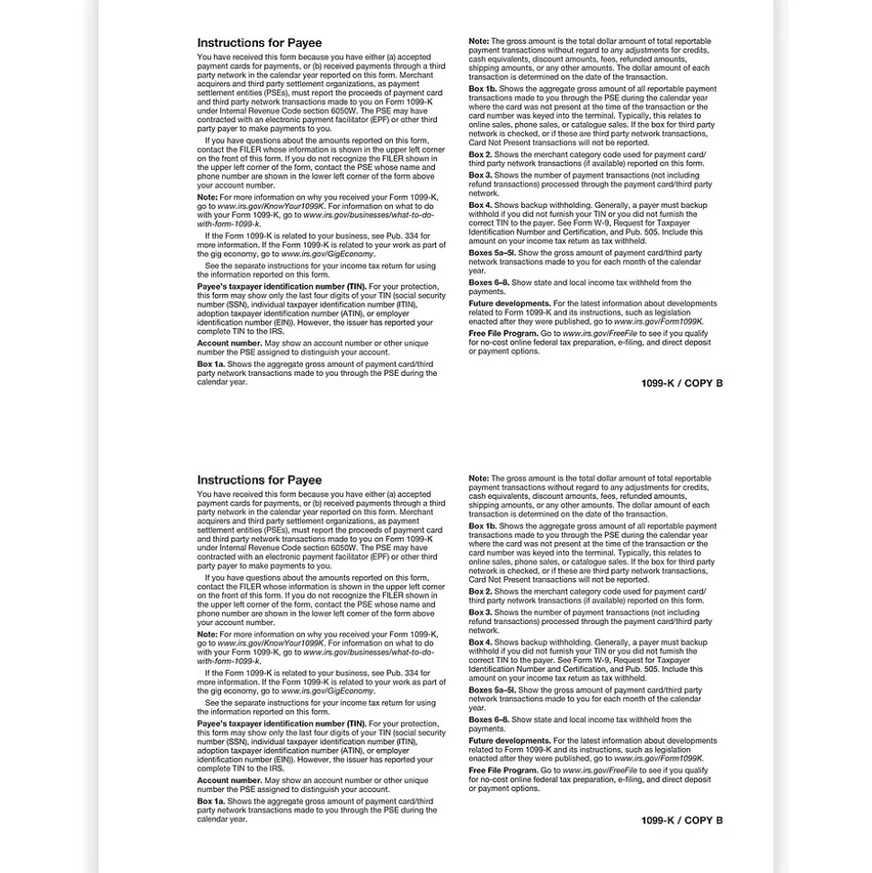 - Form 1099-K for payments made in settlement of reportable payment transactions for each calendar year