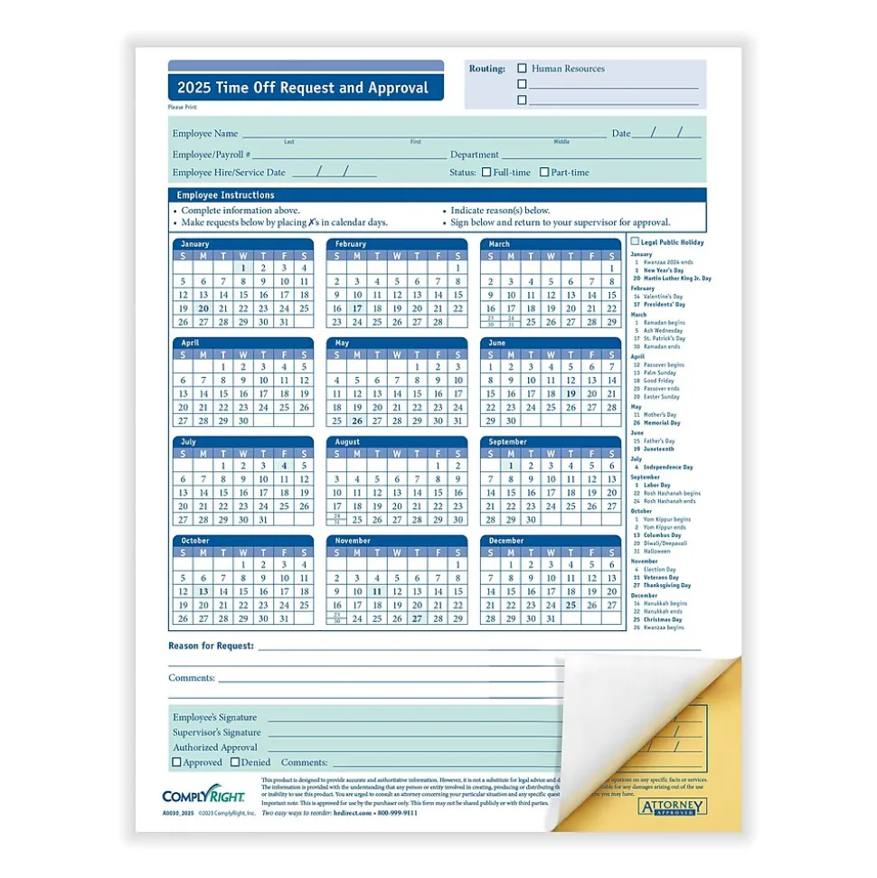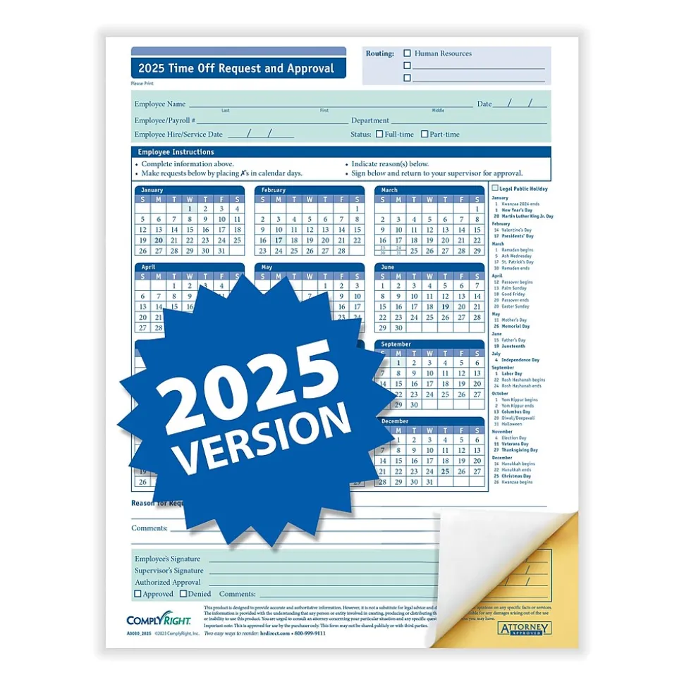 The Time Off Request and Approval form utilizes an efficient calendar format, to show time off requests for a full year. This effective format allows employees to clearly mark the days they want off, and from there, managers can quickly review and approve the requested days. The use of this form helps to create a consistent process across your business. The 2-part format allows you to keep a copy for your records and provide one to the employee for theirs.