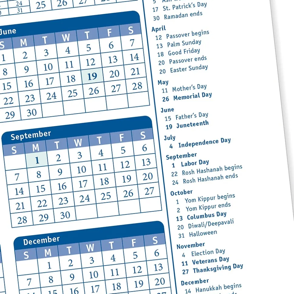 - Calendar includes holiday list with legal public holidays shaded