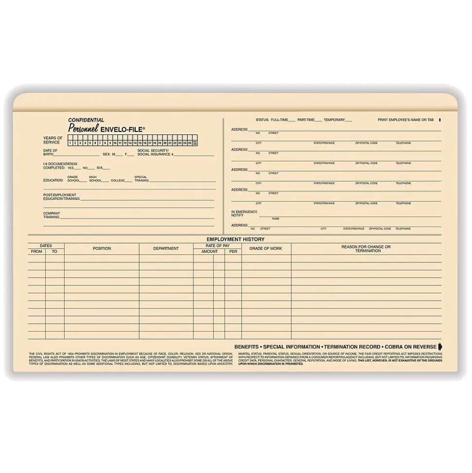 Even in today’s digital work environment, maintaining original employee records is necessary. The legal-size ComplyRight Confidential Personnel Envelo-File is ideal for safely storing employment applications, evaluation forms, warning notices and other employee paperwork. The smart design also allows you to record key information and benefits right on the folder, putting everything at your fingertips for greater convenience.