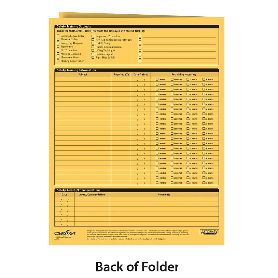Don’t be caught unprepared when an OSHA inspection happens. Keep your OSHA mandated safety training records organized and easy to review in the ComplyRight Employee Safety and Training Records Folder. This convenient folder stores emergency information, accident reports, training records, violations, specific hazardous material records, personal protective equipment requirements and more.