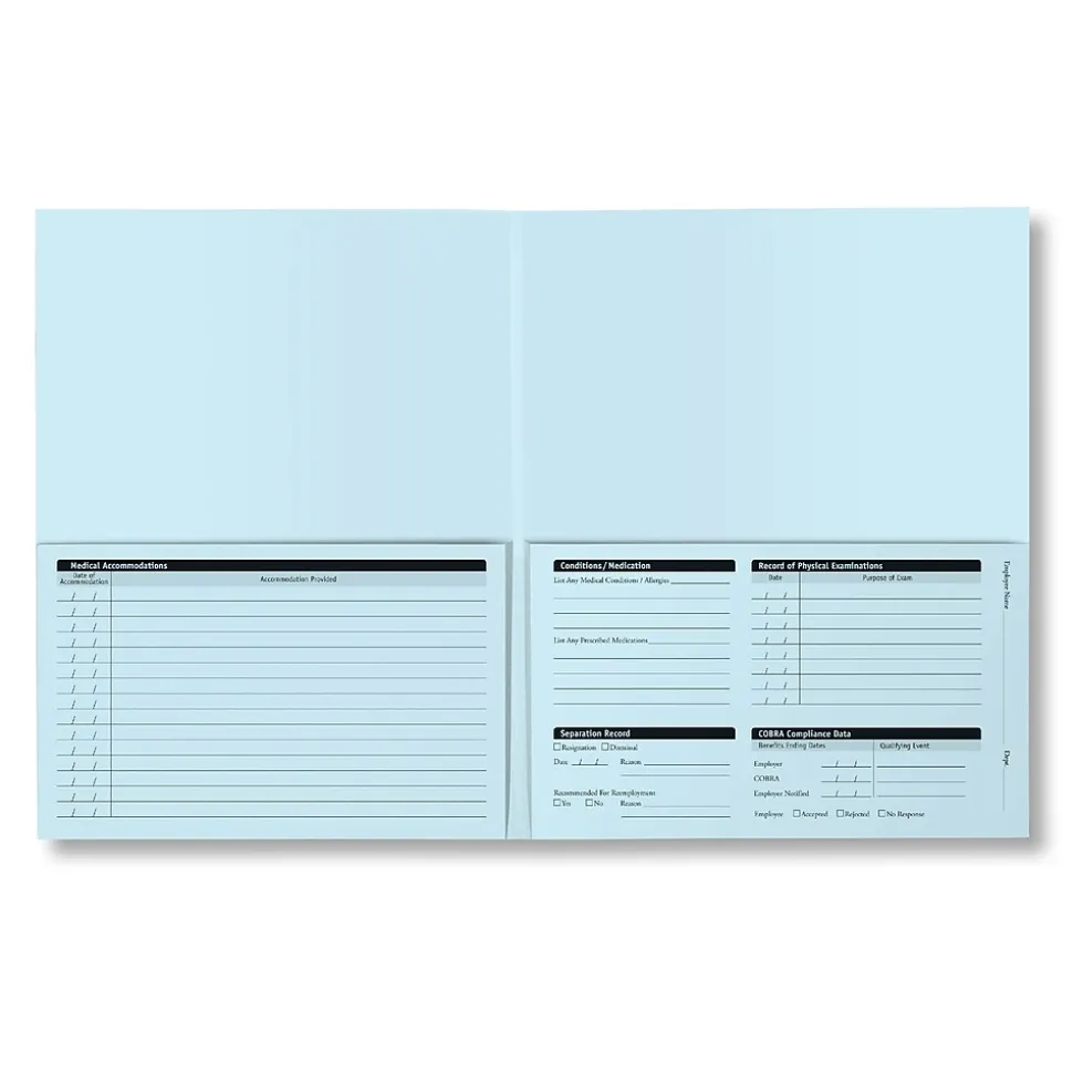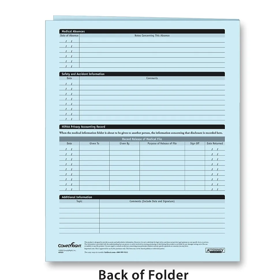 The ComplyRight Confidential Employee Medical Records Folder – Expanded – keeps your employee medical records separate from other personnel information, which is required by law.The expanded folder provides double the storage capacity, allowing more than 50 files to be stored in each of the inside pockets. This folder is more than just a practical recordkeeping tool though, this folders ensures you’re safeguarding private employee health information in strict compliance with ADA, FMLA, OSHA, and HIPAA. The folder also simplifies the employee medical records documentation process by using the sections on the front of each inside pocket to record medical and emergency contact information, plus medical, dental and life insurance information.