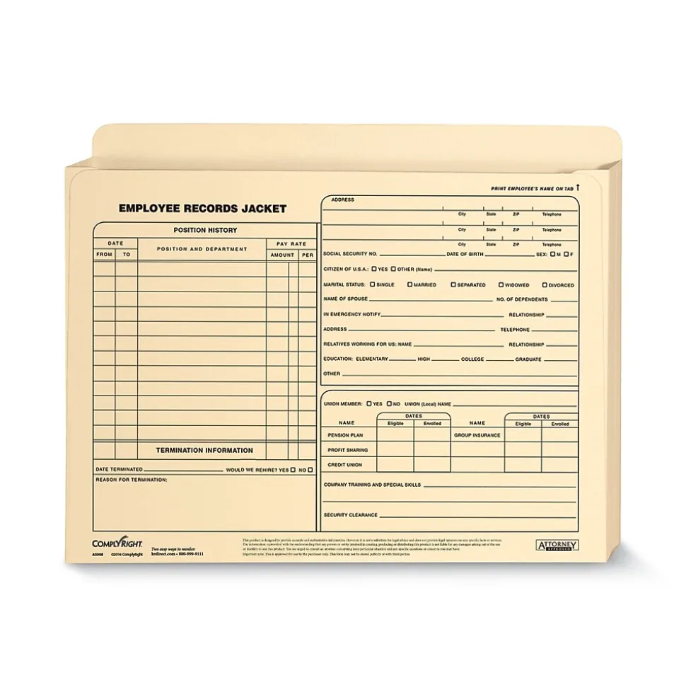 The ComplyRight Employee Record Jacket, Expanded Legal Size, stores all of your confidential employee documents, such as legal forms and papers, in one convenient location.It also expands up to 1.5” for ample storage. The outside of the jacket features fields for frequently requested employee information such as home address, emergency contact and dates of employment.