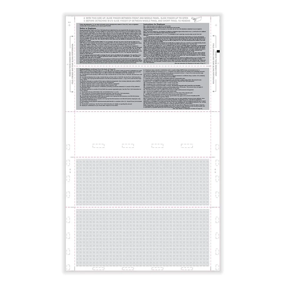 Use W-2 pressure seal forms to easily print and mail a large volume of employee W-2 forms. Blank 4-Up horizontal W-2 pressure seal form with backer instructions. One employee per page. Eccentric Z fold allows you to print check and mailing information on the same side, no need to duplex.