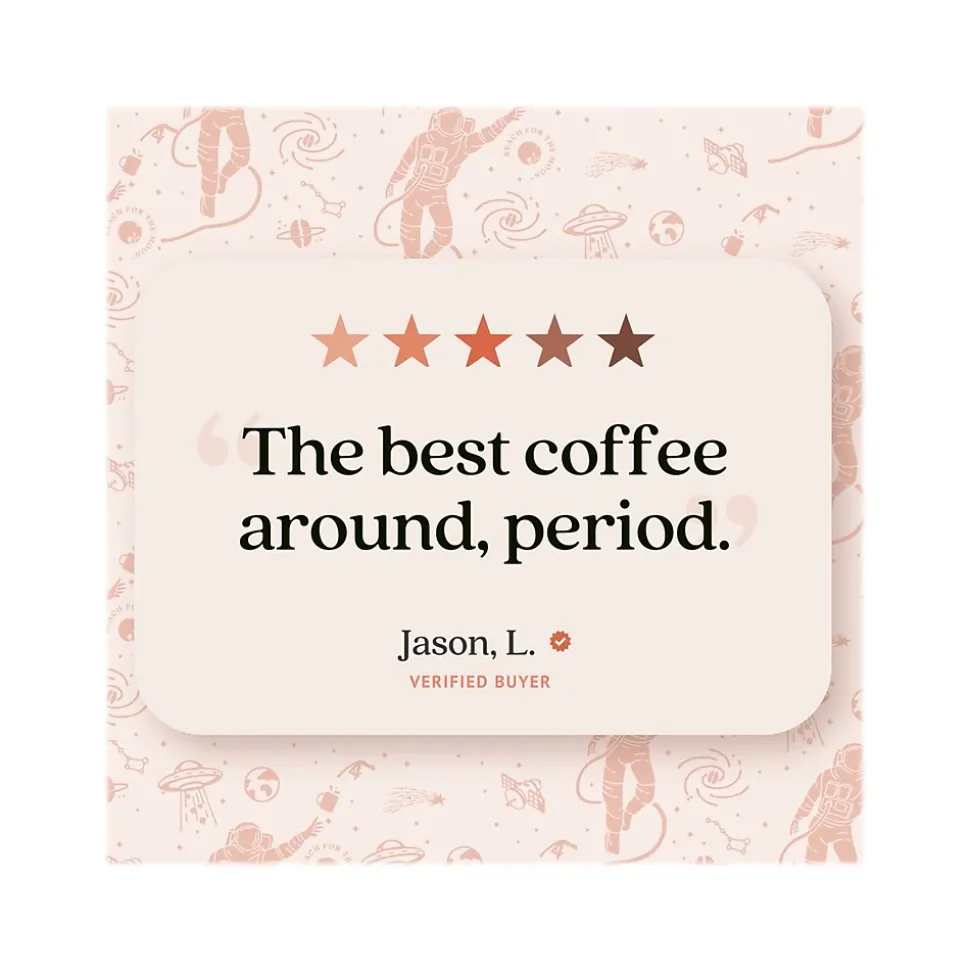 The Copper Moon Coffee Bean Me Up premium coffee blend will prepare you to be “beaned up” into outer space with this lightly roasted blend that’s truly out of this world. This tasty light roast coffee has bright, chocolaty flavor notes and is a perfect choice to kickstart your mornings.
