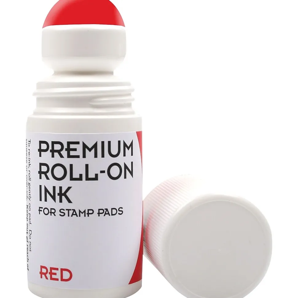 Cosco® 2000 PLUS® Roll-on ink in red color dries quickly and is perfect for office use. Ink meters onto stamp pad evenly/thoroughly and helps maintain cleanliness at workplace while re-inking.