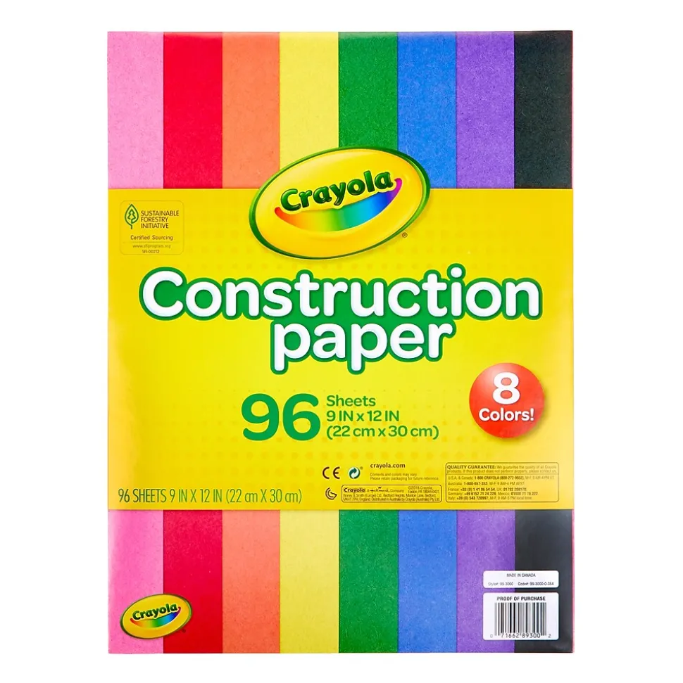 Crayola Construction Paper is a must-have for home and school projects! This large paper pack includes 96 sheets of construction paper in a standard 9×12 inch paper size. The thick, high quality sheets are perfect for coloring, cardmaking, crafting and more! Plus, this set features 8 paper colors including: Pink, Red, Orange, Yellow, Green, Blue, Violet and Black. Pair with a set of Crayola Crayons (sold separately) for a great bundled gift for kids.