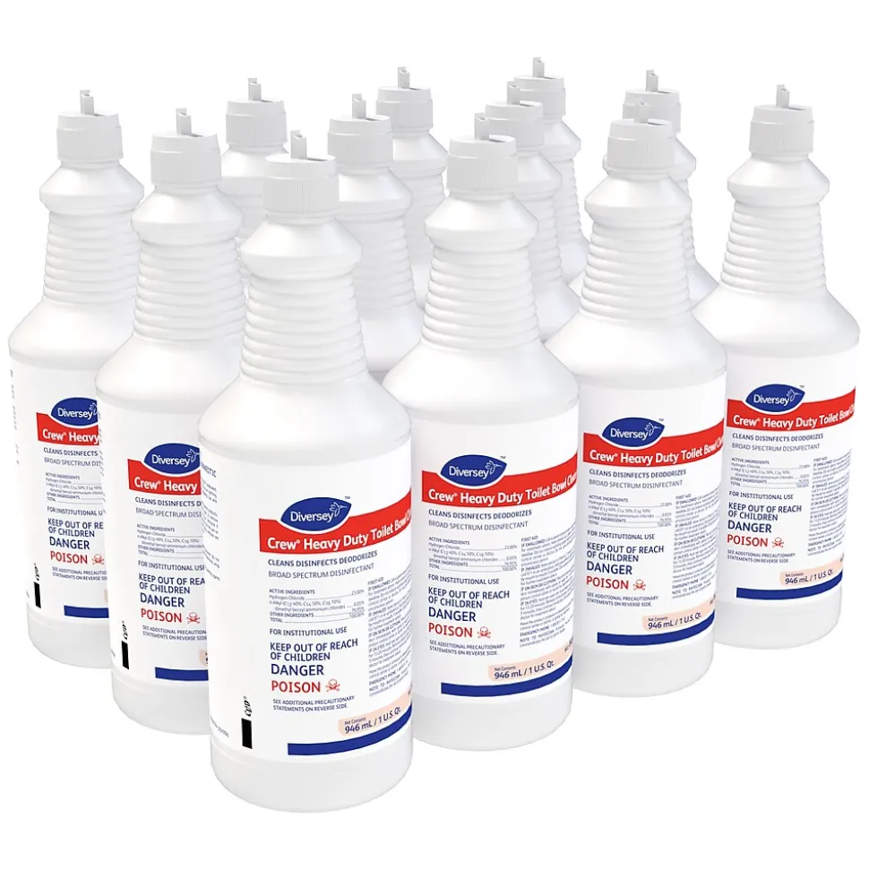 Erase stubborn buildup of lime, uric acid, and other mineral deposits with this heavy duty toilet bowl cleaner. The uniform coating allows for quick and simple cleaning, while the special formula kills bacteria, removes rust stains, and neutralizes odors. This Crew heavy duty toilet bowl cleaner has a convenient handle for easy pouring and comes in a mint scent, providing a clean, fresh smell.