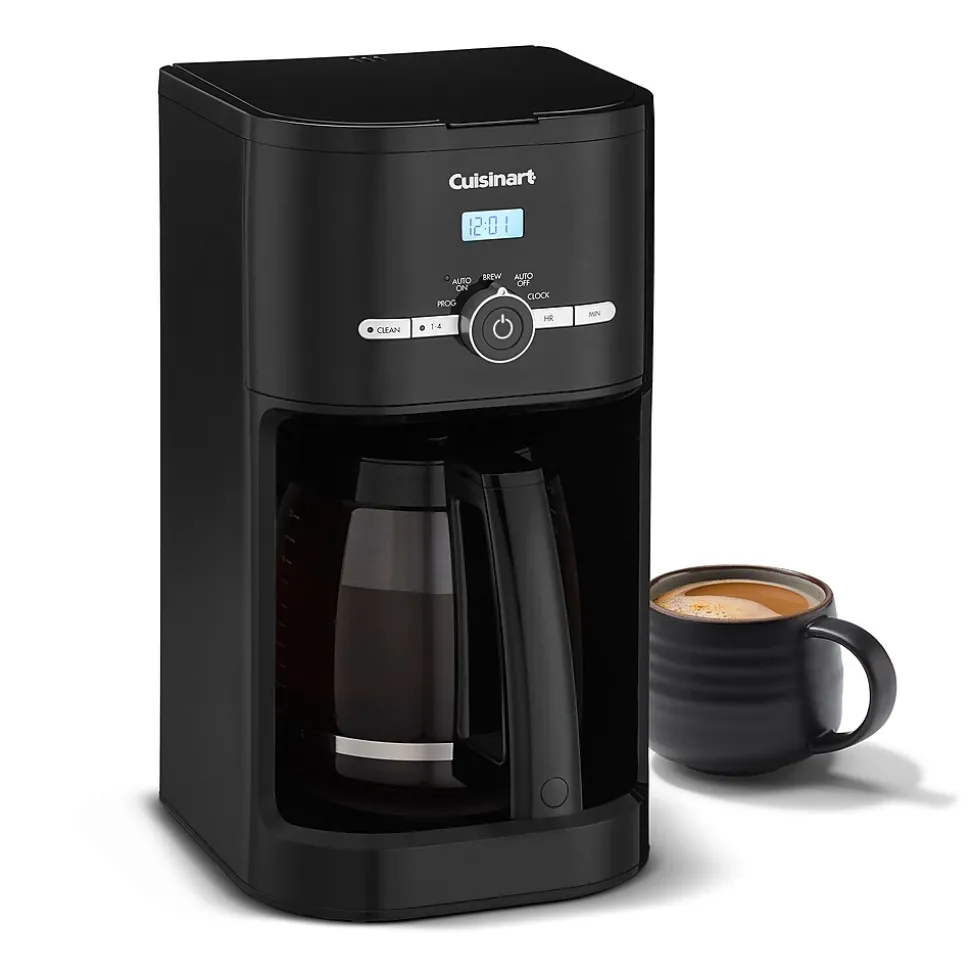 The Cuisinart Classic Coffeemaker brings fresh coffee brewing to your kitchen with classic styling that’s beautiful, functional, and easy to program. Make 1-4 cups—or as many as 12—in the large-capacity carafe that features an ergonomic handle, knuckle guard, and drip-free spout for safe and fuss-free serving. Program brewing up to 24 hours in advance, set it to turn off automatically, or sneak a quick cup in the middle of a brew cycle with the Brew Pause feature. The most delicious hot coffee is fast and fresh when filtered through both an easy-clean, permanent gold tone filter and a charcoal water filter. Make your most delicious cup of the day right at home with Cuisinart.