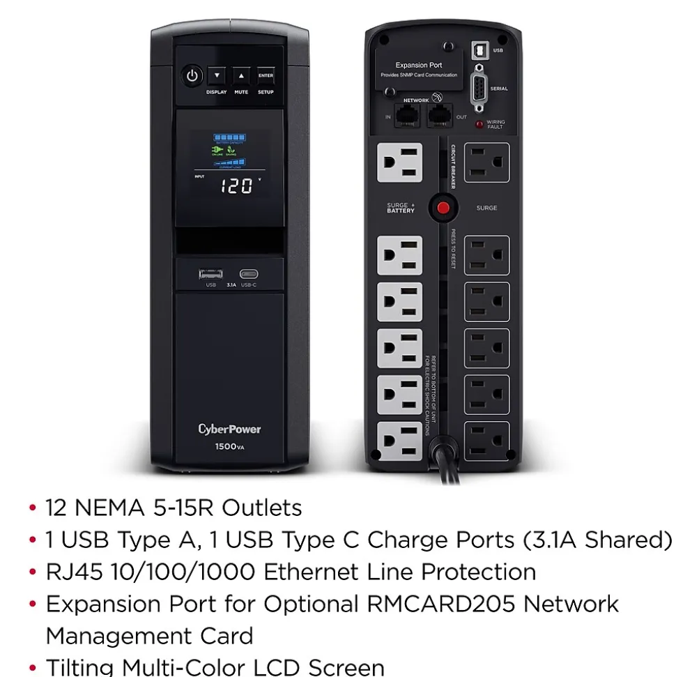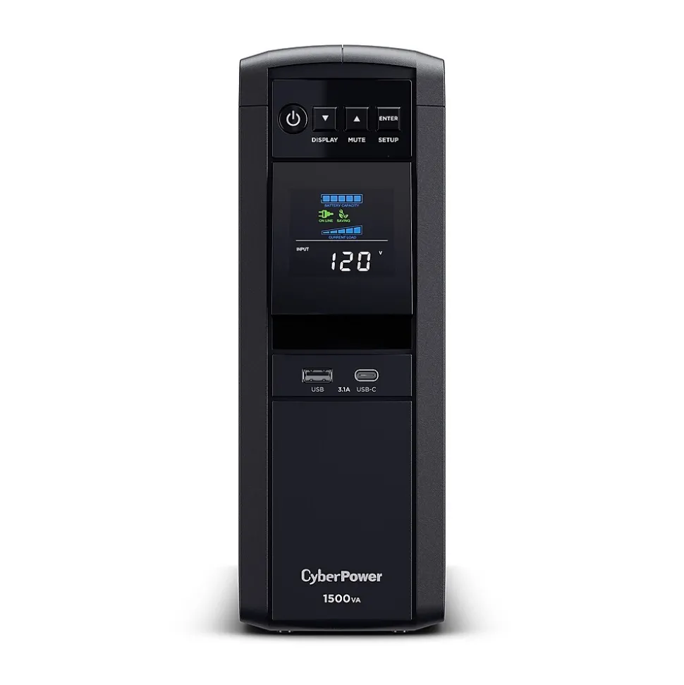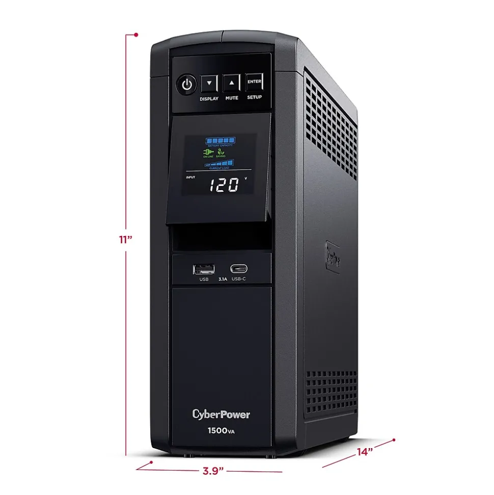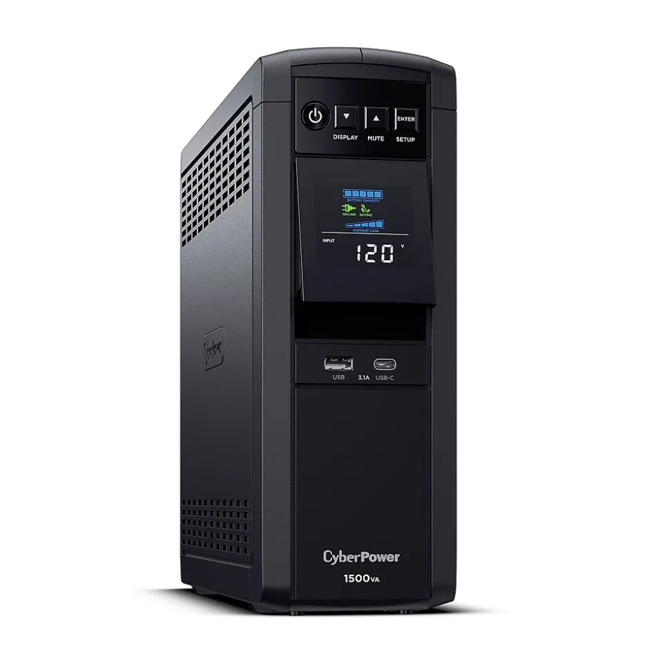 This mini-tower uninterruptible power supply (UPS) provides battery backup power (using sine wave output) and surge protection for connected equipment including computers, networking devices, personal electronics, and entertainment systems. Sine wave output is necessary for devices that require Active Power Factor Correction (Active PFC) power source compatibility. Additional features include automatic voltage regulation (AVR) to correct minor fluctuations without switching to battery mode, a multifunction LCD with color display to keep you informed about power conditions, and two USB charging ports to conveniently charge and power mobile devices. The PFC Sinewave CP1500PFCLCD comes with a three-year warranty (including coverage of batteries) and a $500,000 lifetime connected equipment guarantee.
