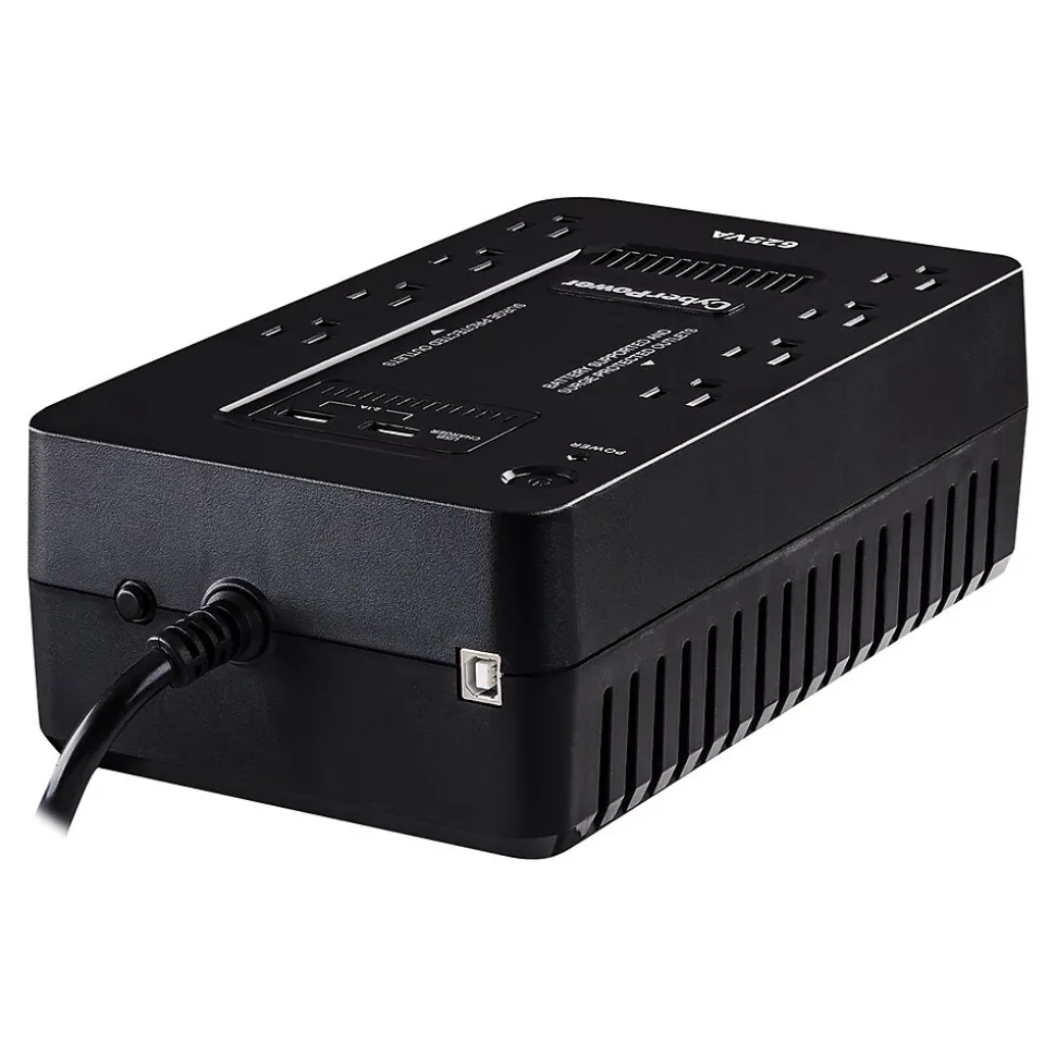 The CyberPower ST625U uninterruptible power supply (UPS) system provides battery backup and surge protection for lightning-induced surges and other power events that can damage electronic equipment. This unit delivers enough battery backup to power connected electronics through utility power failure and enough runtime to perform a graceful shutdown to protect against the loss of data and damage to valuable electronics during longer outages. The ST625U has two USB charging ports with 2.1 amp shared total output which gives you a faster charging time. This unit is designed to minimize noise for a quieter work environment and to run efficiently to reduce power consumption. Including a sleek design, this UPS is perfect for all your home office and entertainment needs, including computers, gaming consoles, and broadband routers.