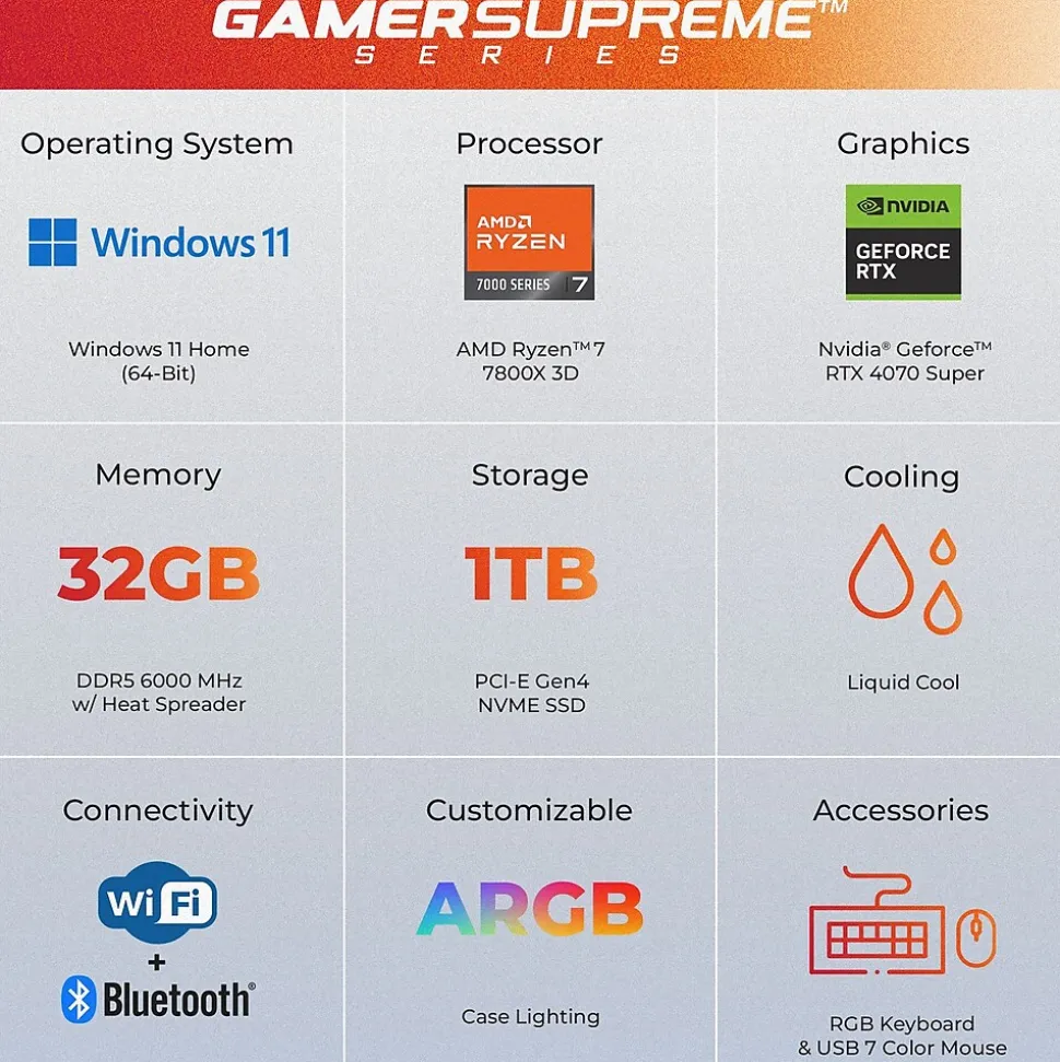 Get the pinnacle of gaming performance with the CYBERPOWERPC Gamer Supreme series of gaming computers. The Gamer Supreme series features monstrous processing power combined with the latest and greatest graphics cards to handle even the most demanding games on the market. An immense RAM allows you to easily tackle system-intensive applications such as video editing, and ensures a lag-free multitasking experience.