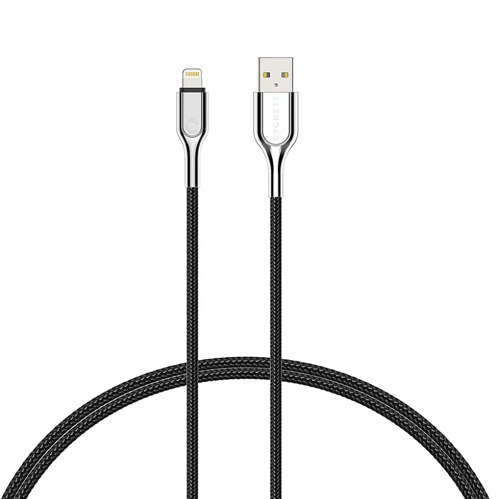 Charge and sync your Apple device with this 6 ft. Cygnett Armored Lightning to USB Cable! Armored has received Appleās seal of approval, meaning it has been certified to meet Apple performance standards. This premium charging cable is officially verified to work flawlessly with your iPhone, iPad and more. Charge and sync all your Lightning connector devices quickly and safely with 2.4 amp/12 watt fast charging. Simply plug the USB end directly into any USB port to stay connected while you’re at home, at work, or on the road. The Black robust cable design the exterior double braiding allows the cable to resist abrasion whilst maintaining flexibility for ease of use. The cable connectors forged from a metallic alloy provide a refined aesthetic and superior scratch resistance.