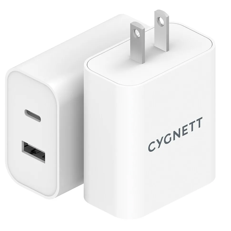 Charge multiple devices at once with the Cygnett PowerPlus 38-Watt Dual Port Wall Charger! This 38-watt dual USB wall charger features 20 watts of USB-C Power Delivery, plus 18-watts USB-A. It can fast charge any Samsung, iPhone, iPad, or Google Phone, and can charge 2 devices at once!