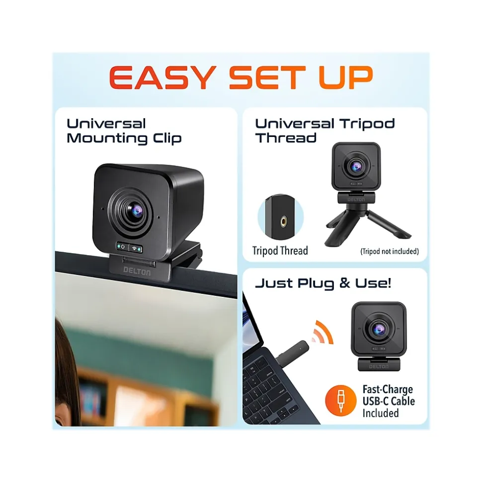 Go beyond what a simple 1080p webcam with microphone can deliver, and confidently move through your presentations or meetings with the Delton wireless HD 1080p video camera. The built-in digital microphones make sure that your audience hears you clearly, while a completely wireless interface means you’re free to showcase the best angles in every presentation. Setup is super simple: just plug the 2.4G USB dongle into your PC/laptop’s USB port, and you’re ready to go. Built-in image technology will automatically make adjustments to color and contrast to get the highest-quality image. Place the computer camera on a monitor using the built-in mount, attach to a tripod (not included) using the tripod thread, or position the webcam at an optimal angle on any surface without worrying about cable reach or tangle. No matter where it stands, the camera will deliver a crystal clear high-definition 1080p image and can comfortably be taken with you mid-stream so that you can showcase your best work.