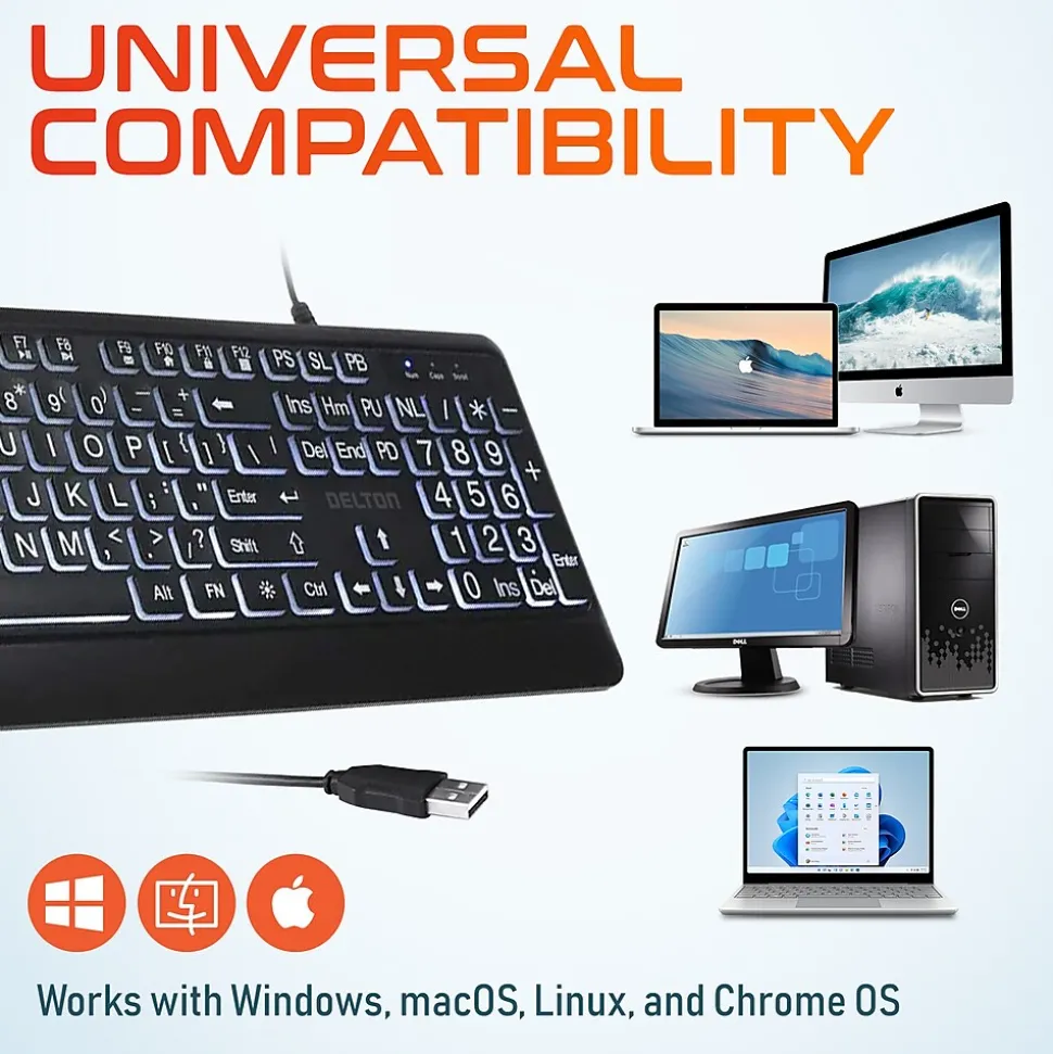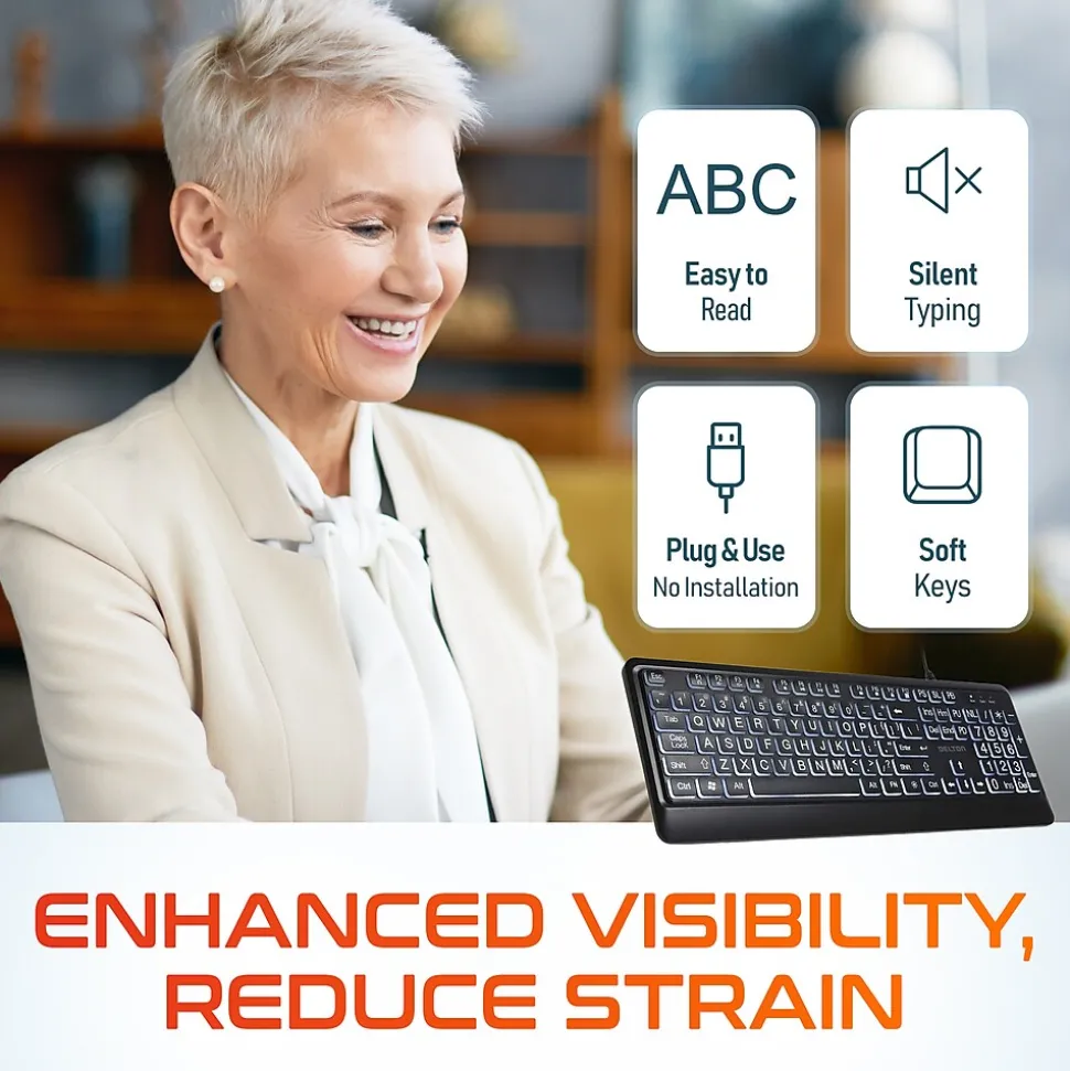 Elevate your typing experience with the Delton KB20 portable keyboard. Built for those who demand clarity and comfort, this backlit keyboard boasts large-print buttons and subtle backlighting, making it perfect for users with low eyesight or seniors seeking ease of use. Whether you’re typing during the day or in low-light conditions, the oversize characters and backlighting ensure excellent visibility at all times. The full-size layout, including a convenient numeric keypad, is complemented by dedicated multimedia keys, streamlining your control over volume and more with a single touch. Engineered to reduce fatigue through thoughtfully crafted keys, this computer keyboard invites you to enjoy extended typing sessions without discomfort. Quick access function keys enhance productivity, allowing for effortless adjustments and navigation. With clear Caps Lock and Num Lock indicators, you’ll avoid common typing errors, ensuring your work remains uninterrupted. Universal OS compatibility means seamless integration with your existing setup, whether you use a desktop PC or laptop.
