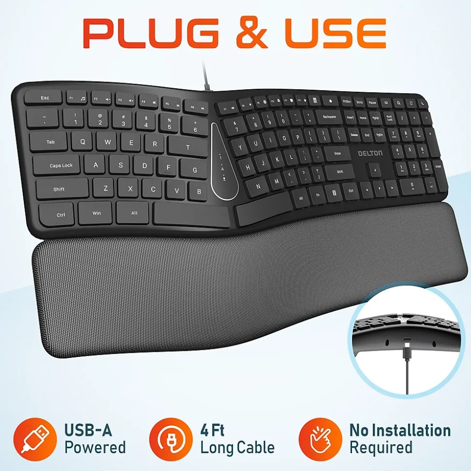 Elevate your workstation with the Delton KB250 computer keyboard, designed to enhance comfort and productivity. This ergonomic keyboard is powered via USB connection, eliminating the need for batteries or separate power sources. The keyboard provides convenient multimedia shortcuts, allowing quick access to volume control, media playback, and other functions. Experience a peaceful work environment with its quiet and curved keys, allowing undisturbed typing. It features a full-size layout with a numpad, providing ample space and convenience for all your typing needs. This wired ergonomic keyboard boasts a curved design that aligns with the natural shape of your hands, promoting a more comfortable typing posture. It also comes with a wrist pad to support your wrists during long periods of typing, reducing strain and discomfort. This silent keyboard offers universal compatibility, effortlessly working with Windows, Mac, PCs, and laptops, ensuring seamless use across different devices.