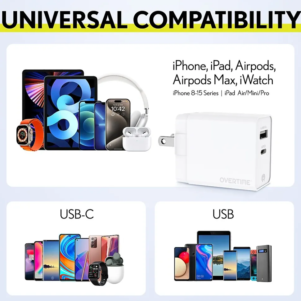 Don’t get caught with a red battery indicator! Order your super-fast iPhone/Android mobile phone charger today! This dual port phone charger plug has you covered for all your device charging needs, at home, in the office, or on the go! Equipped with both USB-A and USB-C ports, the this wall adapter uses USB-C Power Delivery 3.0 technology to charge your devices in less than half the time of traditional chargers! The 18-Watt USB port uses Quick Charge 3.0 technology to give you the fastest charging time of any USB-A adapter. Conveniently small and portable, keep this wall charger with you for powering up at home, in the office, or on the go.