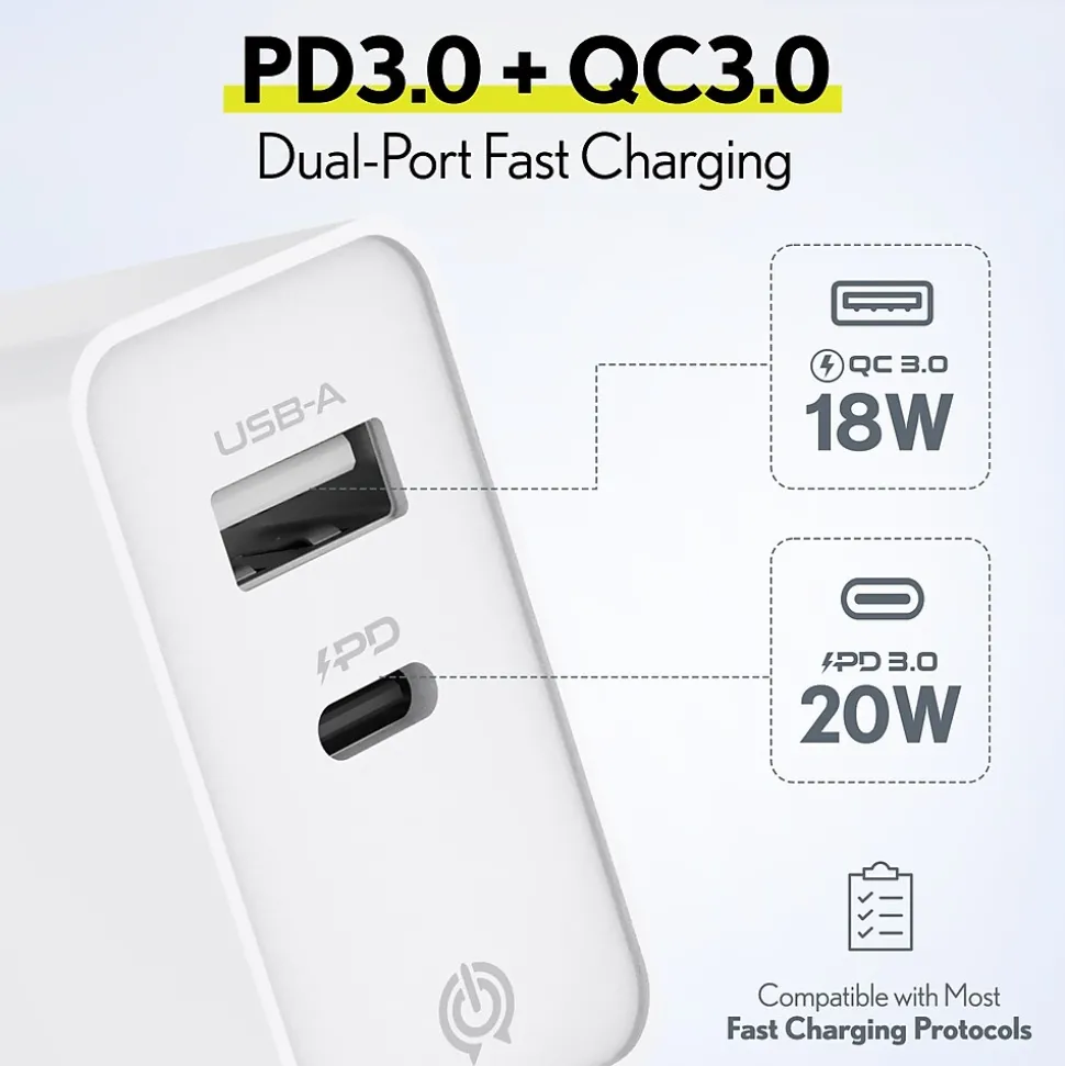 - Included in the package: Dual USB/USB-C 20W home charging adapter.