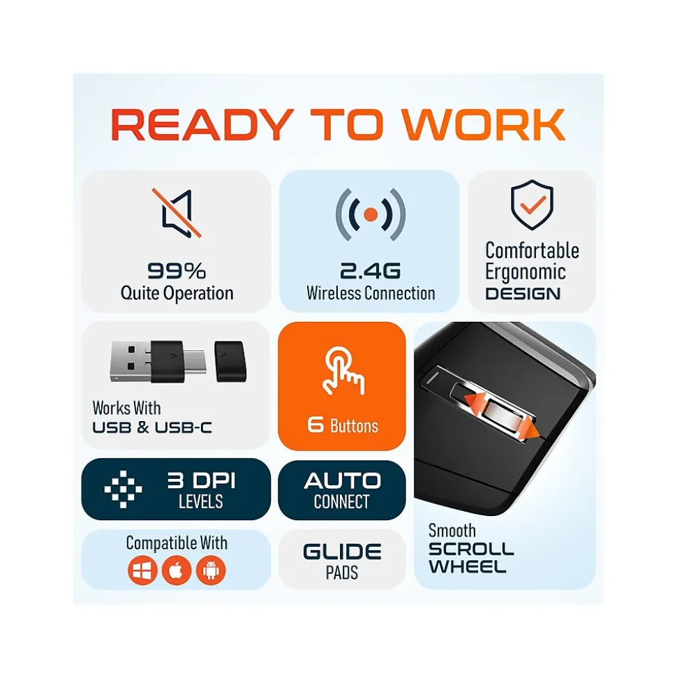 - Includes: wireless mouse, auto-pair dongle with USB and USB Type-C connectors, user manual