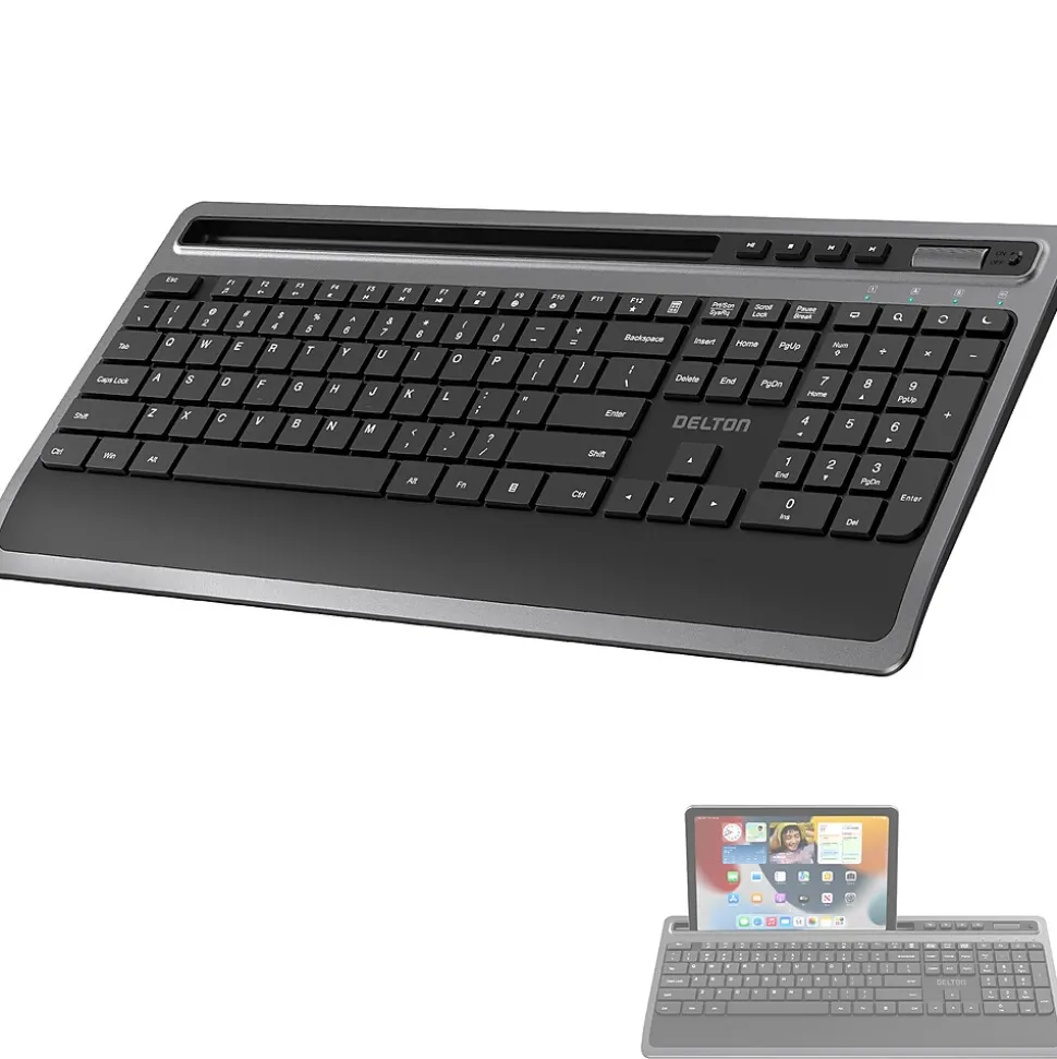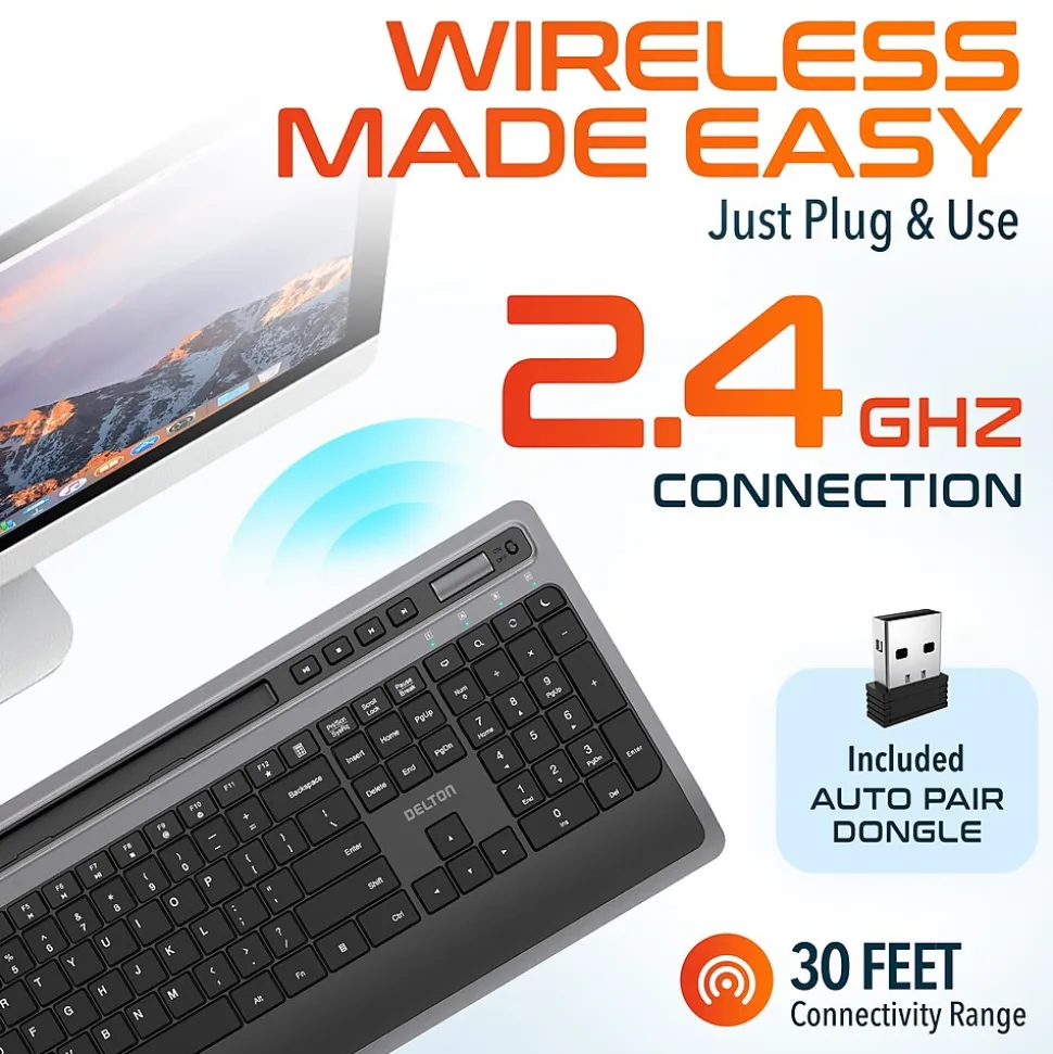 Elevate your typing experience with Delton T42 ergonomic keyboard wireless, designed for ultimate comfort and efficiency. Featuring a stable 2.4GHz wireless connection with a range of up to 30 feet, this office keyboard ensures smooth and uninterrupted performance. The full-sized 114-key layout of the wireless keyboard for laptops includes a numpad and 12 USB dedicated multimedia keys, allowing easy control of media and enhancing productivity. Enjoy the convenience of auto power-saving mode that activates after 10 minutes of inactivity and instant wake-up with a simple button click. This cordless keyboard seamlessly connects with PCs, laptops, and tablet PCs and is compatible with Windows, iOS, MacOS, and Linux, ensuring flexibility across multiple platforms. The full size wireless keyboard measures 17.38 wide, 1.12 high, and 7.86 deep, offering spacious and portability. Weighing only 1.57 lbs., this silent keyboard is lightweight, making it easy to move and handle.