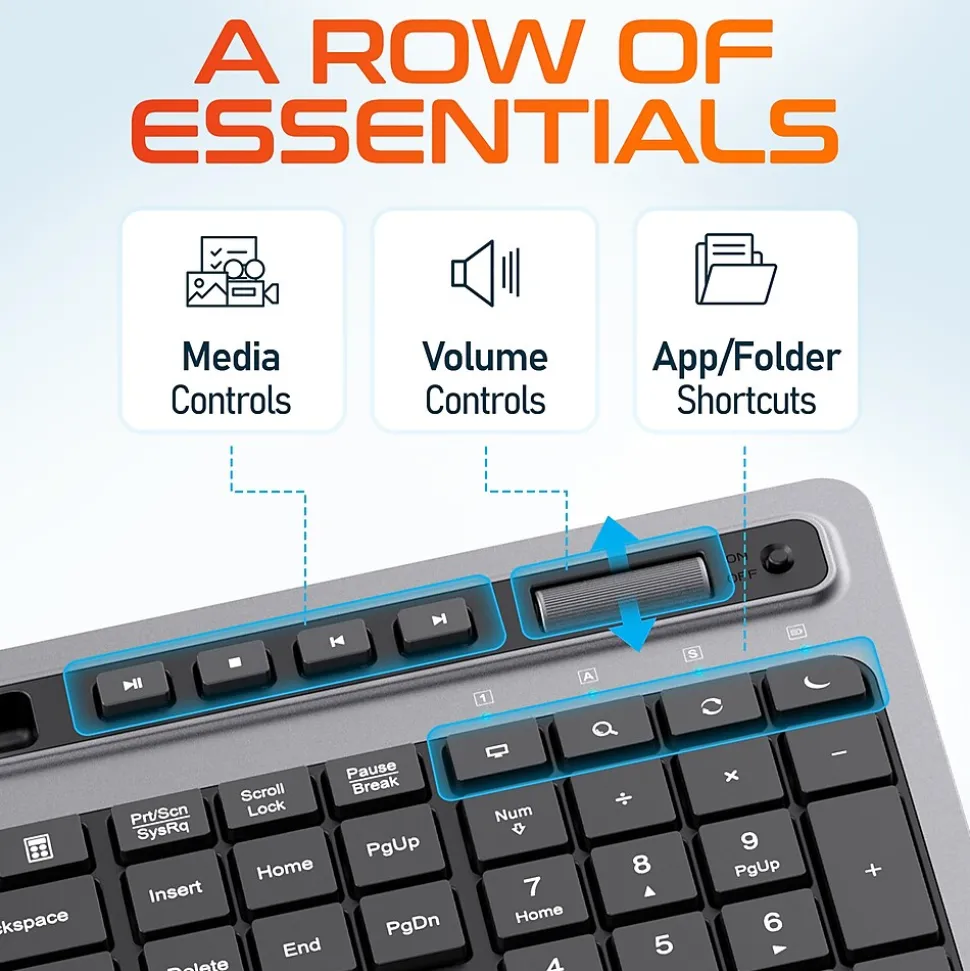 - Our quiet wireless keyboard features a smooth volume up/down wheel, allowing for effortless and precise control of your audio levels.