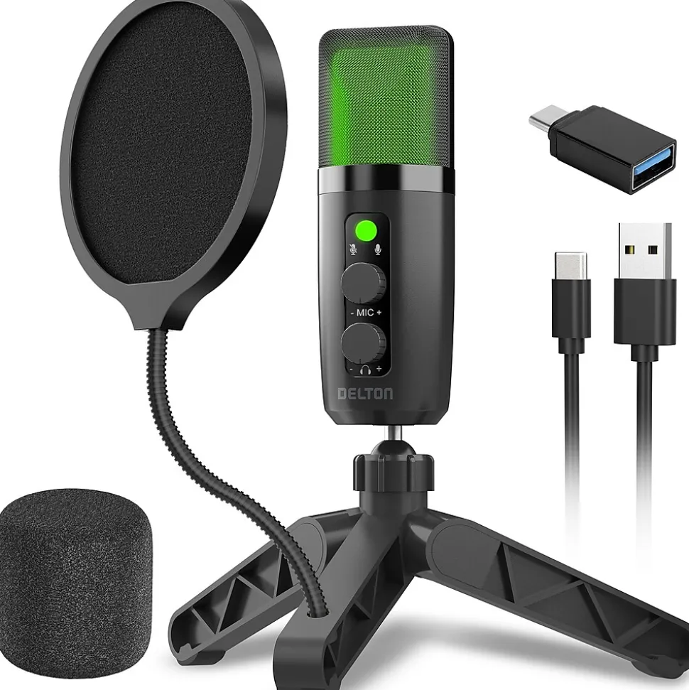 - Included in the package: Delton U3000 Microphone, Tripod Stand, Pop Filter & Filter Holder, Type-C Converter, Type-C Cable & Blowout Guard.