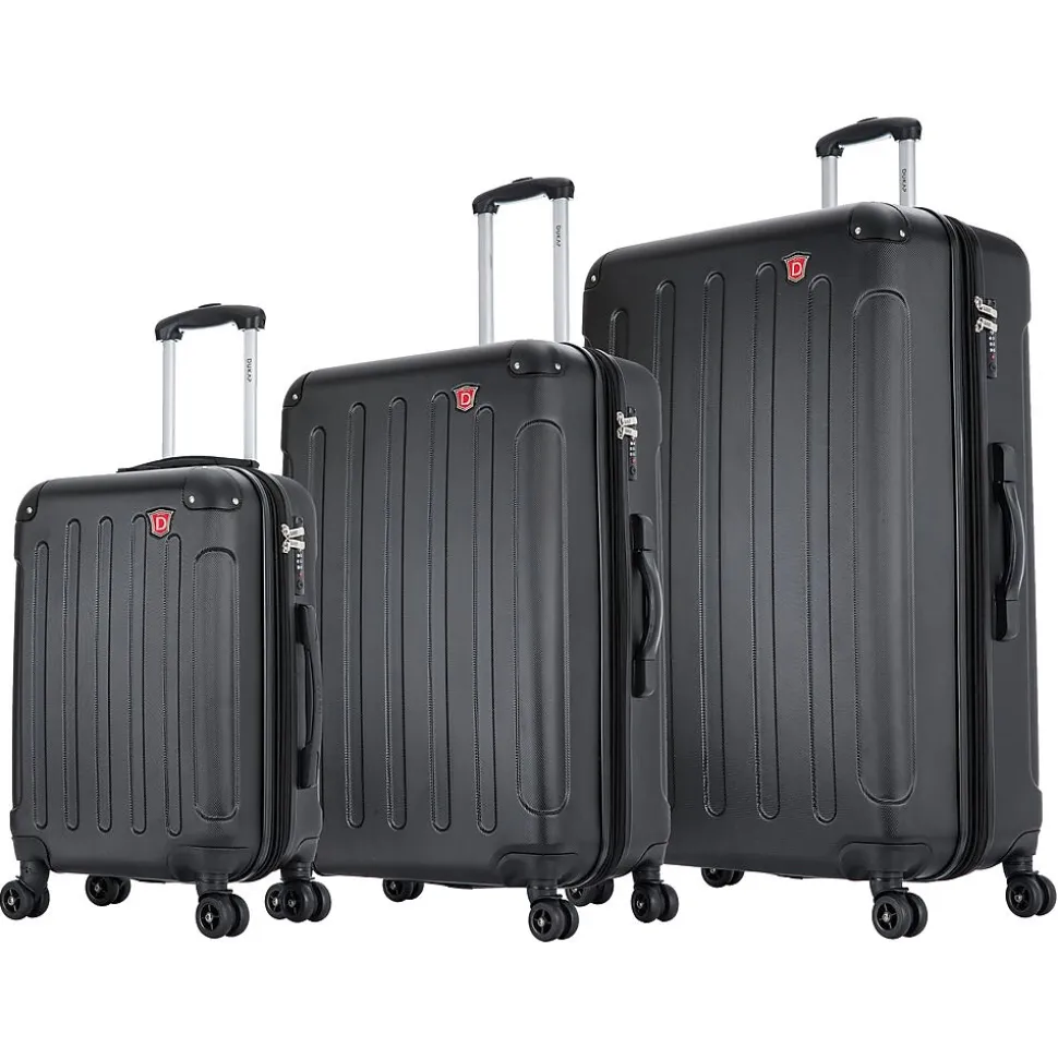 DUKAP INTELY luggage set made of lightweight PC/ABS engineered material with a micro diamond finish. The hard-flex construction offers maximum strength, durability, and a water-/scratch-resistant finish. Protective corner bumpers withstand higher impacts, and four side studs allow the luggage to stand upright. It also features a push-button locking internal retractable trolley system.