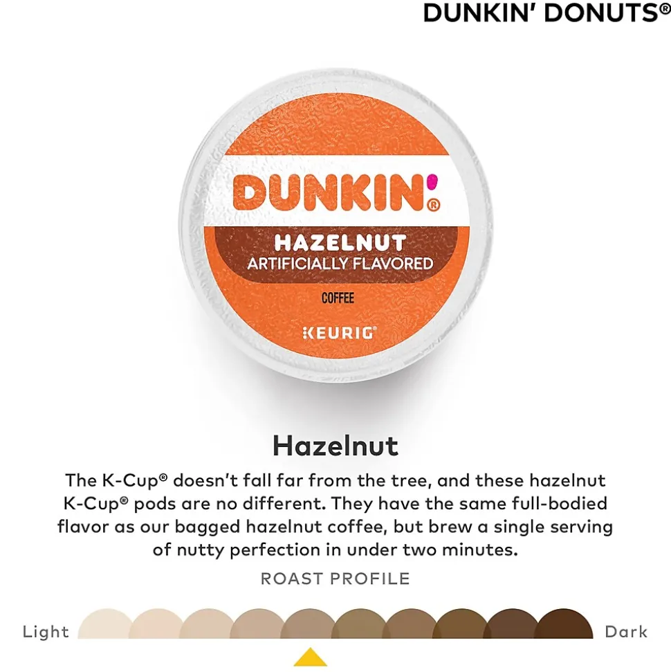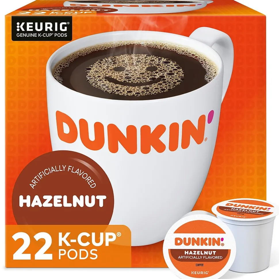 Savor a single-serve cup of Dunkin’ hazelnut coffee with these easy-to-use coffee pods. The medium roast provides rich aromatic flavors for a pick-me-up in the middle of the day, and the 22-count pack ensures you have plenty for everyday use. With no loose coffee or filters, these Keurig K-Cup Dunkin’ coffee pods eliminate the need for cleanup while ensuring fresh flavor from each individual pod. The great tasting flavors and roasts from Dunkin’® are now available in convenient Keurig® K-Cup® pods. The same delicious coffee served in Dunkin’® restaurants is now available for your office with the same consistent taste and recipe used for over 60 years.