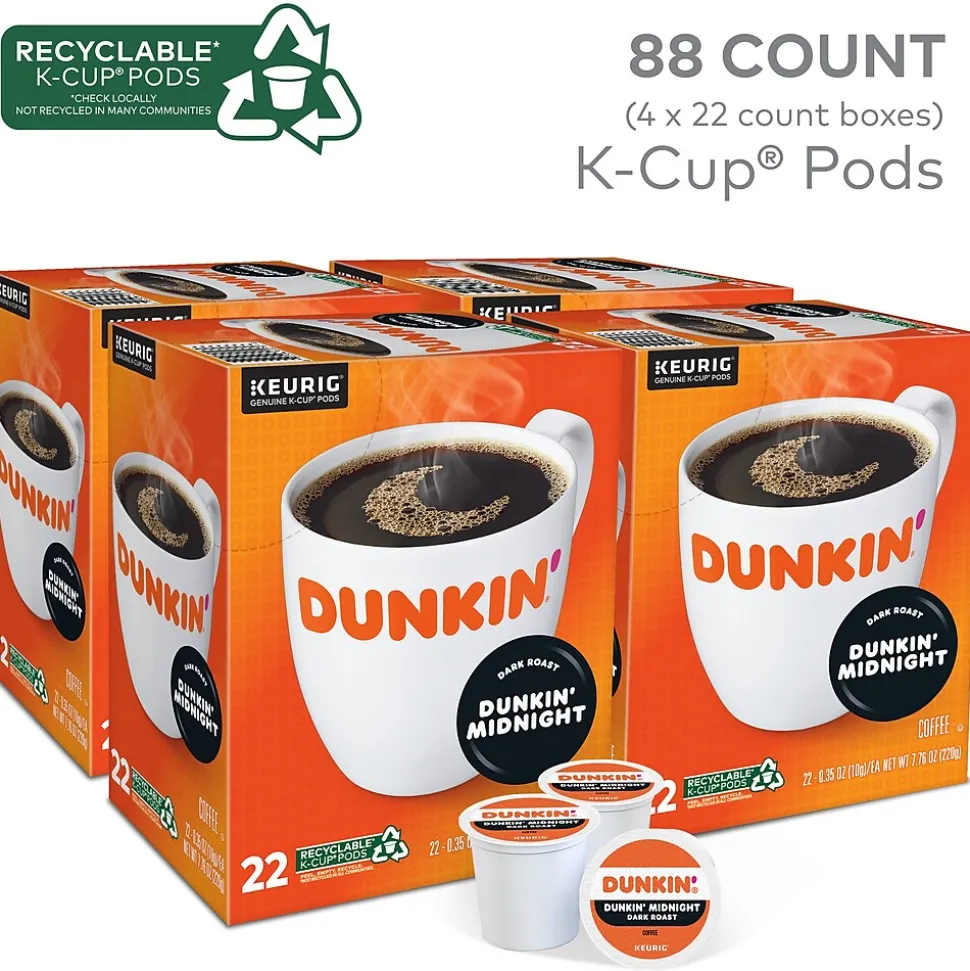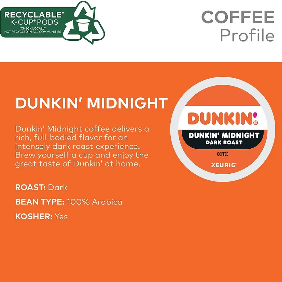 Dunkin’® Midnight coffee is our darkest roast yet! Deep and rich with bittersweet chocolate notes and an intensely dark finish. Dunkin’® Midnight coffee delivers a rich, full-bodied flavor for an intensely dark roast experience. Brew yourself a cup and enjoy the great taste of Dunkin’® at home.This favorite is a delicious delight – rich, intensely dark, with chocolaty notes – flavors that make it the perfect morning cup or a wonderful afternoon treat. It’s a success story that started in 1950 as a single donut shop in Quincy, Massachusetts, and now includes over 9,500 shops. Sure, Dunkin’® has been known for its donuts over the years, but it’s our coffee that’s kept America running.Made from high-quality 100% Arabica beans and a unique, proprietary recipe that people love, it’s a consistent, smooth, never bitter, rich-tasting cup of coffee. Brew, Enjoy, Repeat! Choose from all your favorite Dunkin’® varieties – all smooth, delicious, and ready to brew at the touch of a button. Every Dunkin’® K-Cup® pod is compatible with any Keurig® K-Cup® pod single-serve coffee maker. Just pop one in and enjoy delicious, fresh-brewed coffee in no time at all. Each K-Cup® pod is filled with the freshest ground coffee and brews a great tasting cup of coffee, every time. Certified Union Orthodox Kosher.