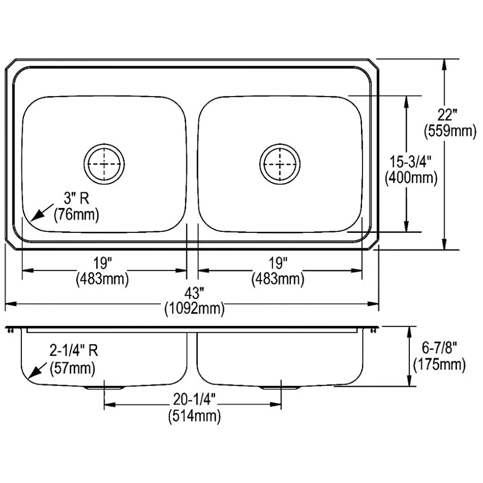 - Dimensions: 22″H x 43″W x 6.88″D; bowl dimensions: 15.75″H x 19″W x 6.75″D; sink drain opening measures 3.5″Dia.
