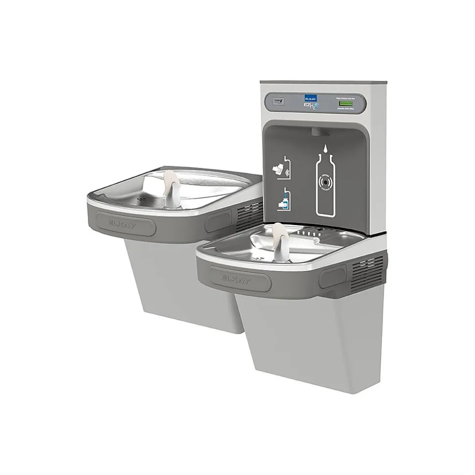 The Elkay EZH2O® Bottle Filling Station delivers a clean quick water bottle fill and enhances sustainability by minimizing our dependency on disposable plastic bottles. Complete cooler and bottle filling station in a consolidated space saving ADA compliant design. NEW Versatile Bi-Level cooler design allows for standard cooler installation of high-left/low-right or the alternate reverse cooler installation.
