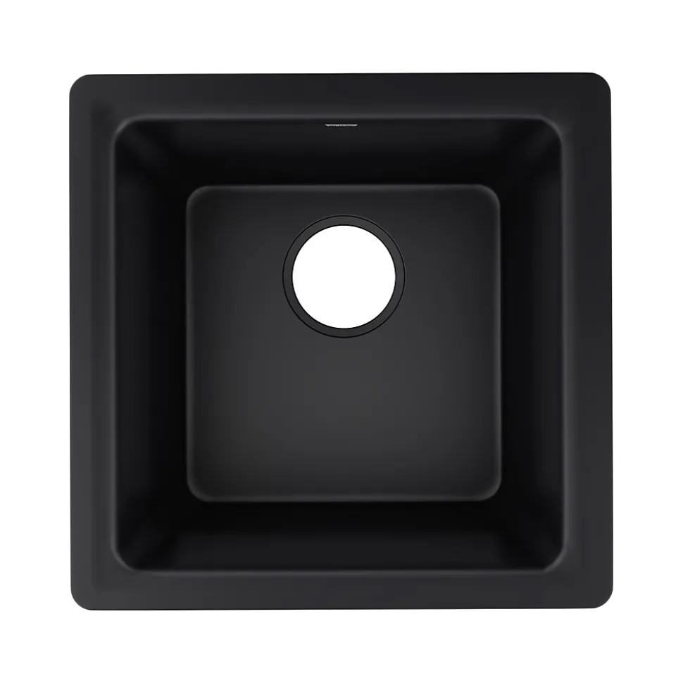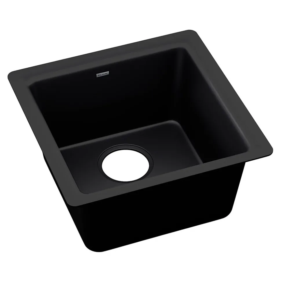 - Made of natural quartz and high-performance UV-stable acrylic resins in caviar color that won’t fade, this durable sink is impact-resistant and remains heat-safe up to 535 degrees Fahrenheit