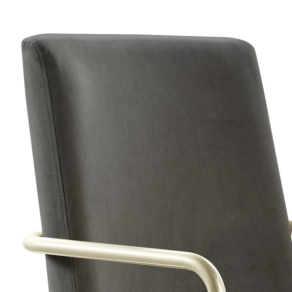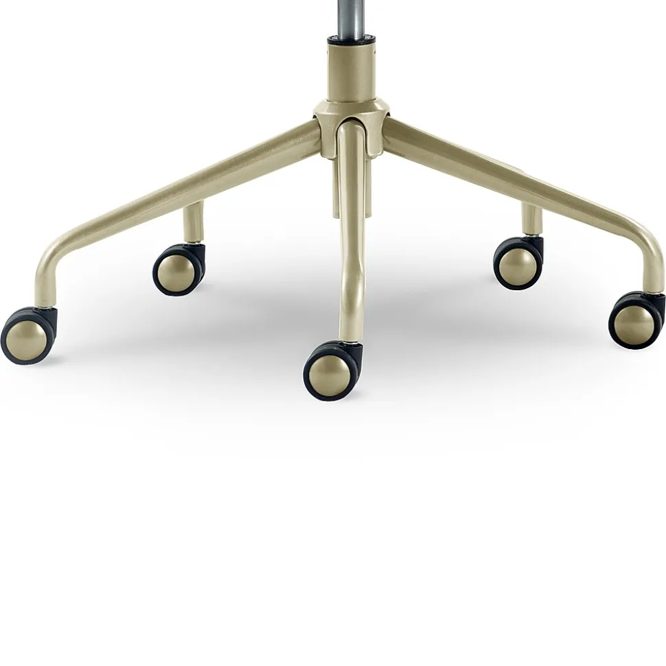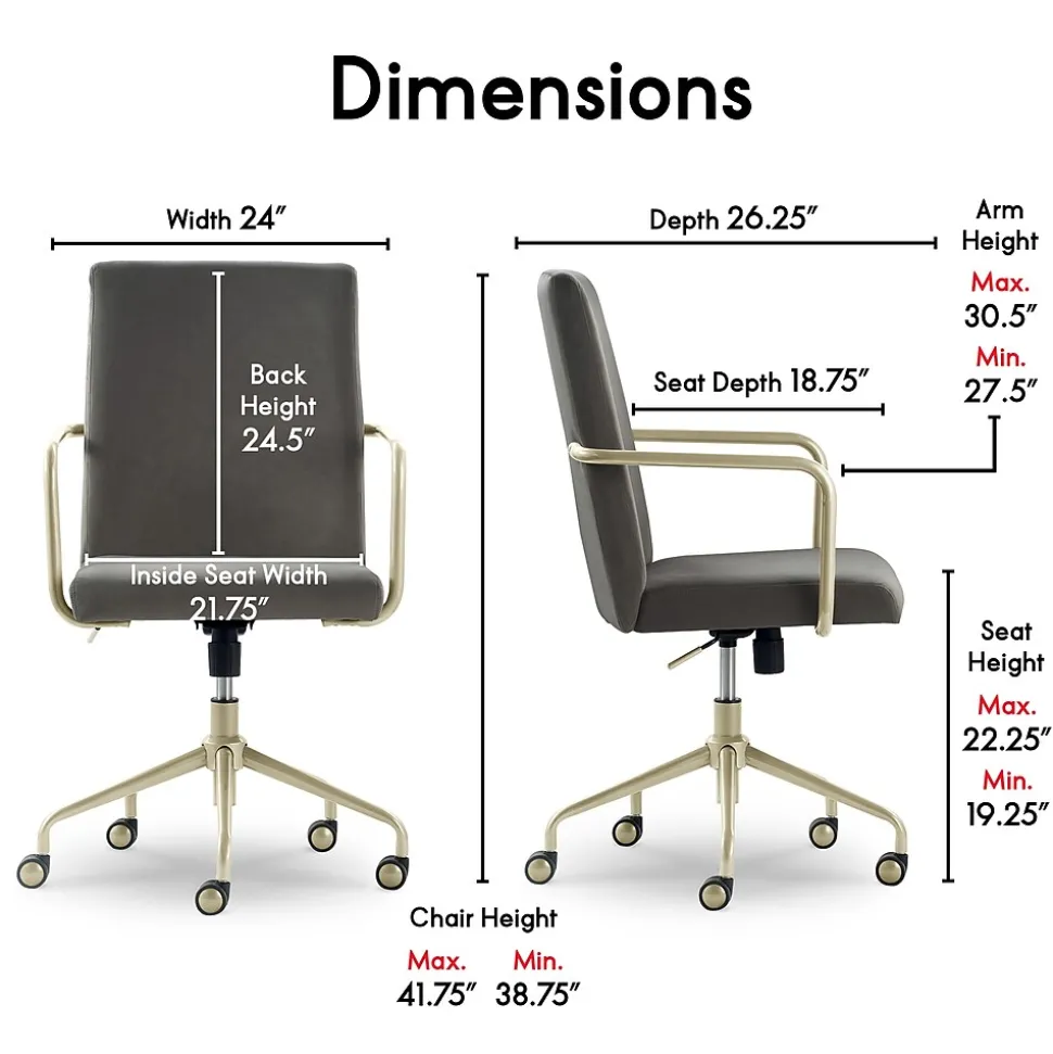 - Lustrous gold metal trim on the base, wheels, and arms adds modern glamour