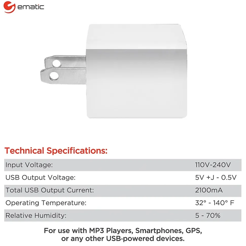 Charge 2 devices at once with the White Ematic 2.1 Amp 2-Port USB-A Wall Charger. This charger features 2 separate USB ports, 1 with 2.1 amps and the other with 1.0 amps. Simply plug your USB cables into the adapter and plug the adapter into the wall. Now you can charge your smartphones, tablets, MP3 players, laptops, and more with ease. The wall charger also protects against overcharging, overcurrents, and overheating, so you can rest assured when you charge your devices.