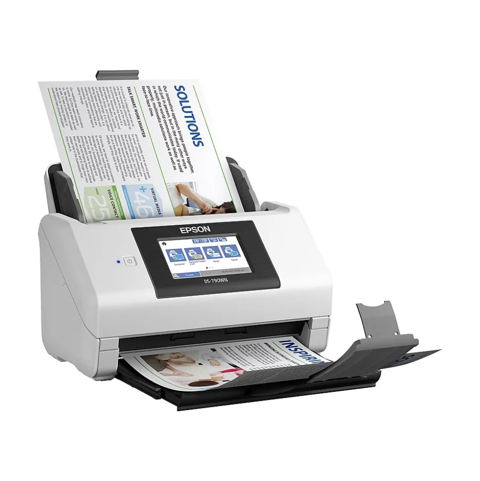 Fast, versatile and powerful, the DS-790WN combines network connectivity, enhanced security features and PC-free scanning so you can manage your business solutions with confidence. Designed for reliability plus ease of use, the DS-790WN delivers high-quality scans up to 45 ppm/90 ipm with a peak daily duty cycle up to 7,000 sheets, one-pass duplex scanning and a high-volume 100-page ADF that accommodates business and ID cards as well as extra-long pages up to 240 inches. The intuitive 4.3-inch color LCD touchscreen allows you to access multiple jobs and email or scan to a USB drive, your network or cloud storage services without the need for a computer. Gain full control of your documents with individual user authentication via the touchscreen or an optional card reader, including customizable scan settings and access to personal usage records. The DS-790WN enables efficient document management and integration to optimize your business – it includes both TWAIN and ISIS drivers for seamless integration with most existing enterprise software. With included OCR software, you can generate searchable PDF files as well as editable Office documents. Built-in LAN and Wi-Fi network connectivity allows for easy scanning, and you can scan with your mobile device using the Epson Smart Panel app on iOS or Android.