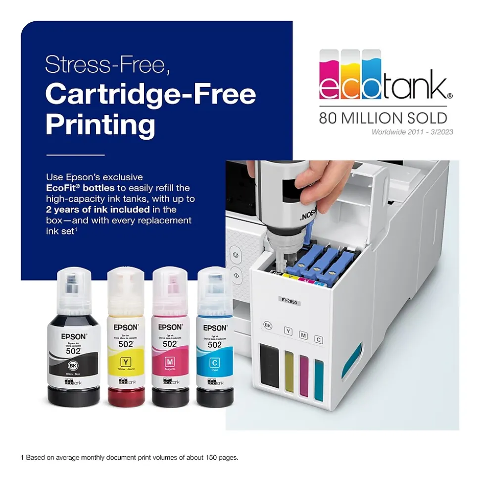 Your home needs a printer that’s fast, affordable, easy to use, and has great features. That’s why we developed the EcoTank ET-2850 – an innovative cartridge-free solution that uses high-capacity, easily refillable ink tanks. So you’ll worry less about running out of ink, and save a lot on replacement ink. The ET-2850 features outstanding print quality, auto-duplex printing, a high-resolution flatbed scanner, and convenient color display – making it the perfect family printer.