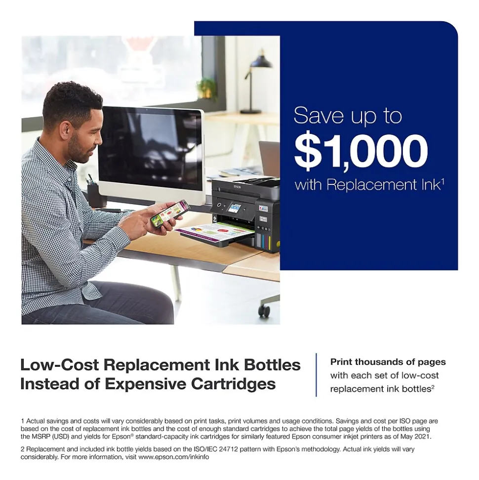 - Dramatic Savings on Replacement Ink – Save up to 90% with replacement ink bottles vs. ink cartridges – that’s enough to print up to 7,500 pages black/6,000 color